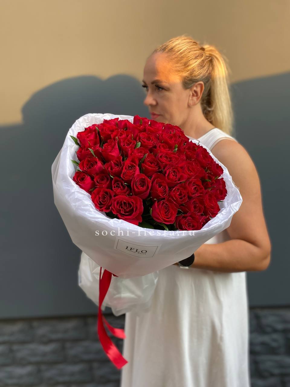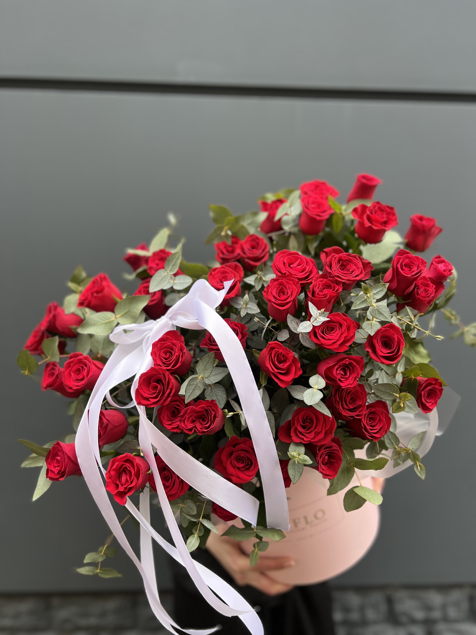 51 роза мадам ред в нежном оформлении
