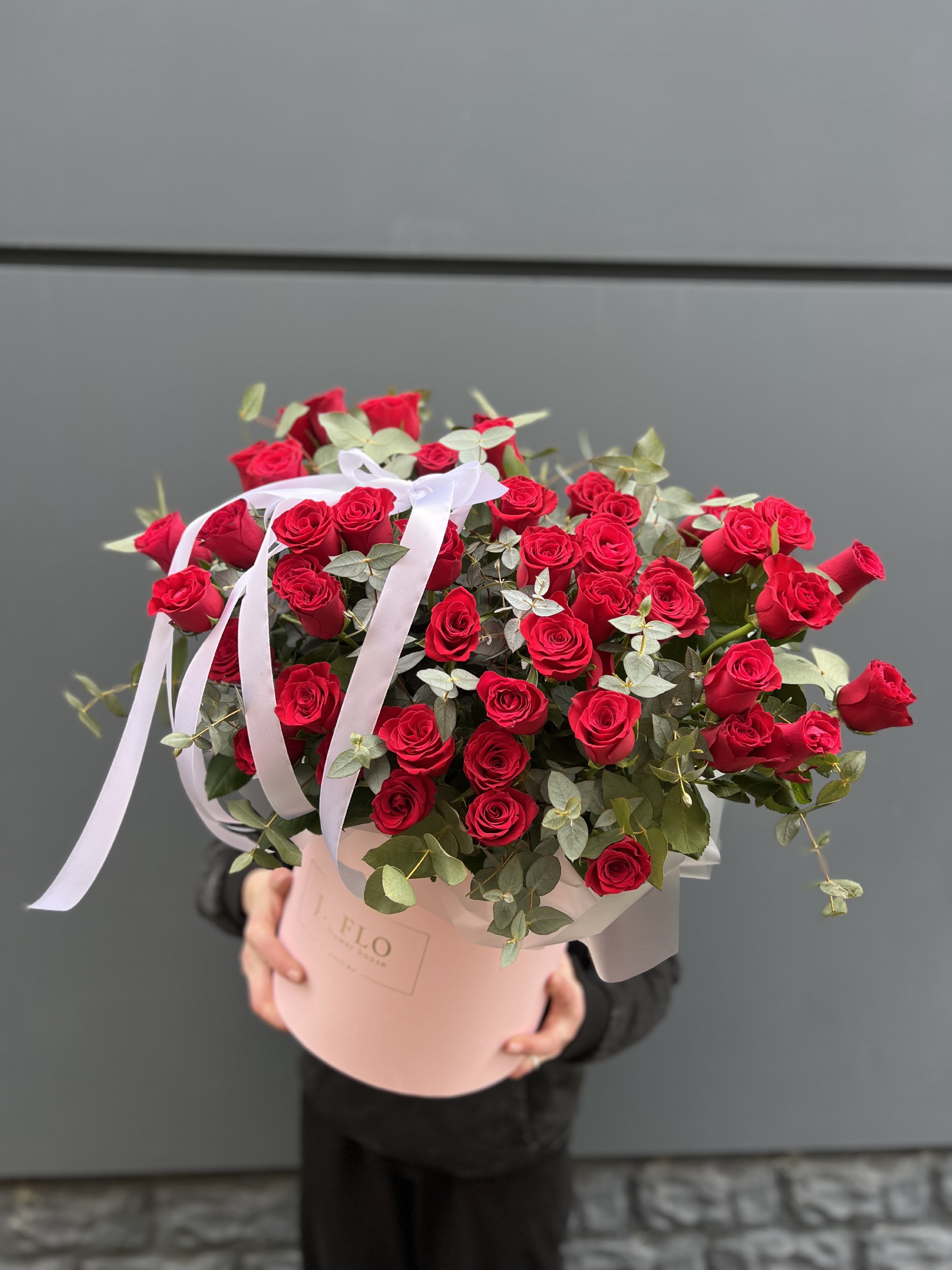 Пятьдесят одна роза насыщенного красного оттенка собрана в плотную композицию. Упаковка мягко обрамляет бутоны, сохраняя естественную форму и создавая цельный силуэт.