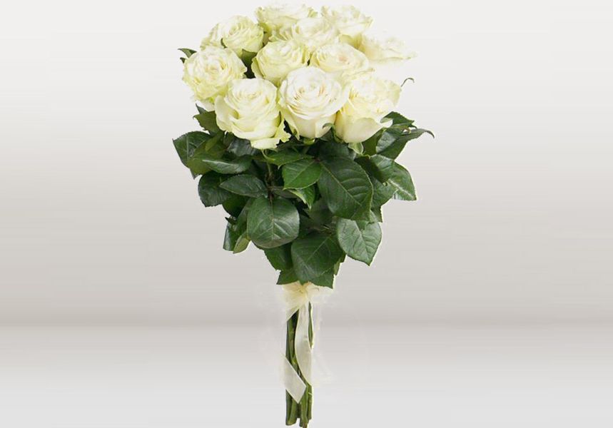 Одиннадцать французских роз выстроены в округлую композицию с веточками эвкалипта. Бутоны крупные и плотные, держат форму и наполняют пространство свежим присутствием.