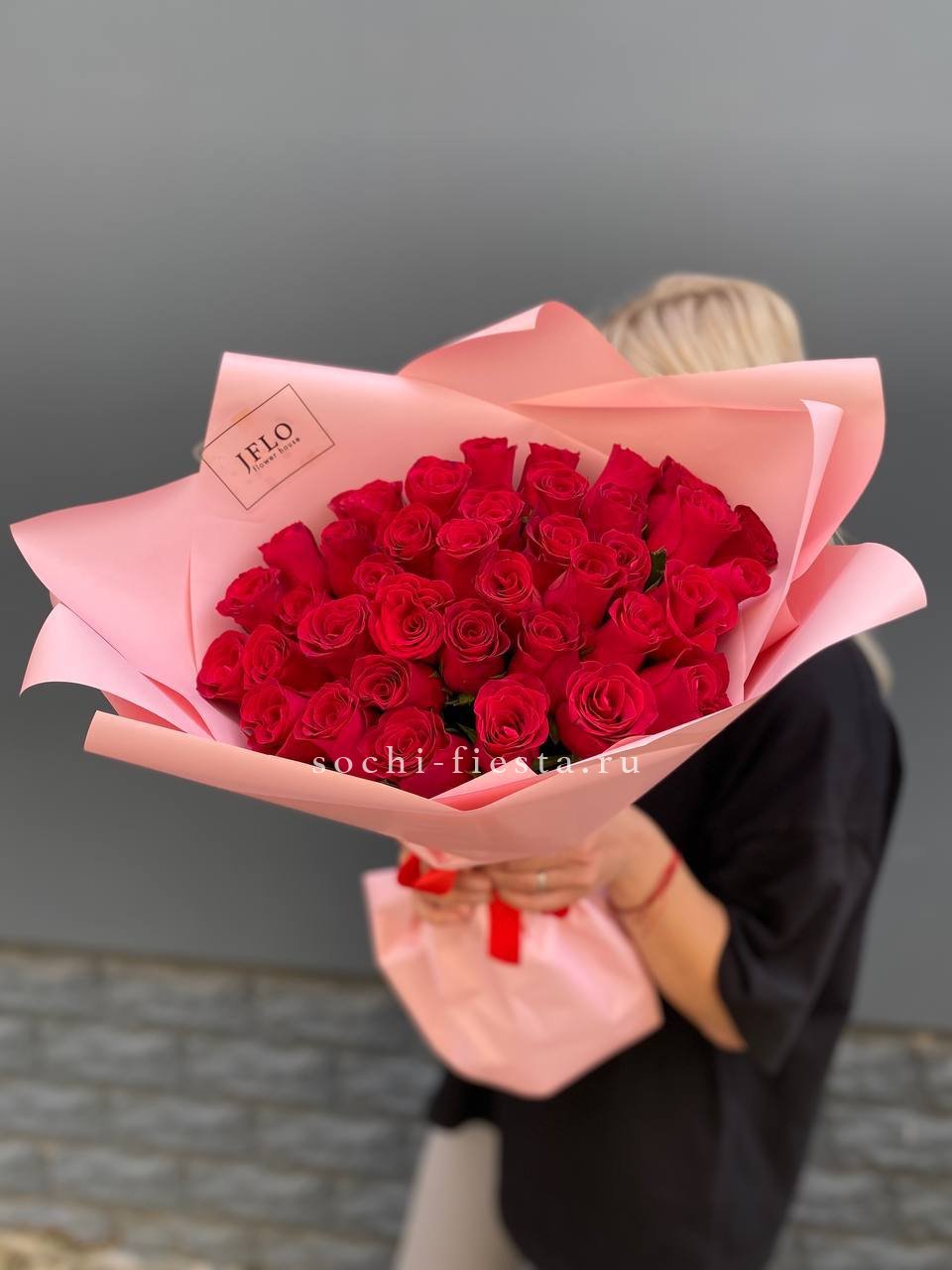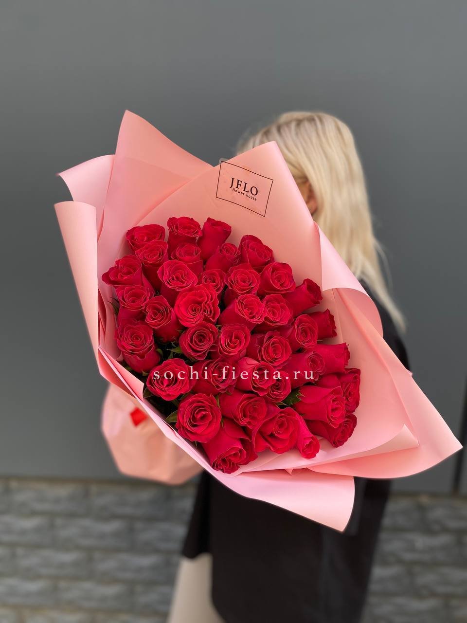 Тридцать один бутон насыщенного красного оттенка собраны в плотную композицию. Упаковка мягко обрамляет цветы, сохраняя естественную форму и позволяя каждому бутону раскрыться в своем ритме.