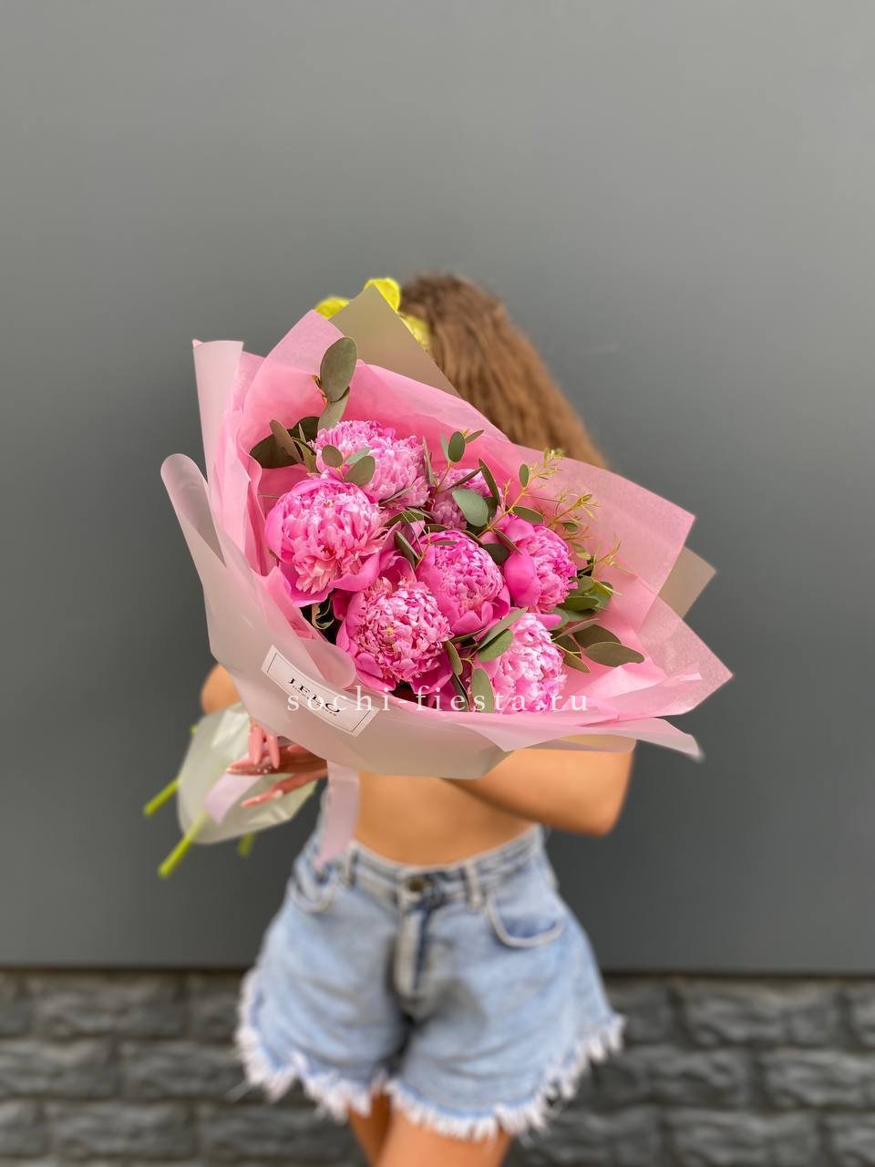 пионы, эвкалипт, тишью, пленка, лента.