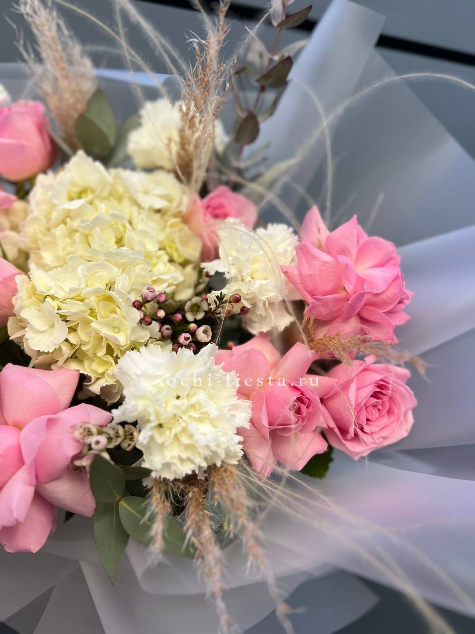 гортензия нежно-розовых оттенков, эустома, львиный зев или маттиола, розовые розы, эвкалипт, вспомогательная зелень, лента, светлая корзин.