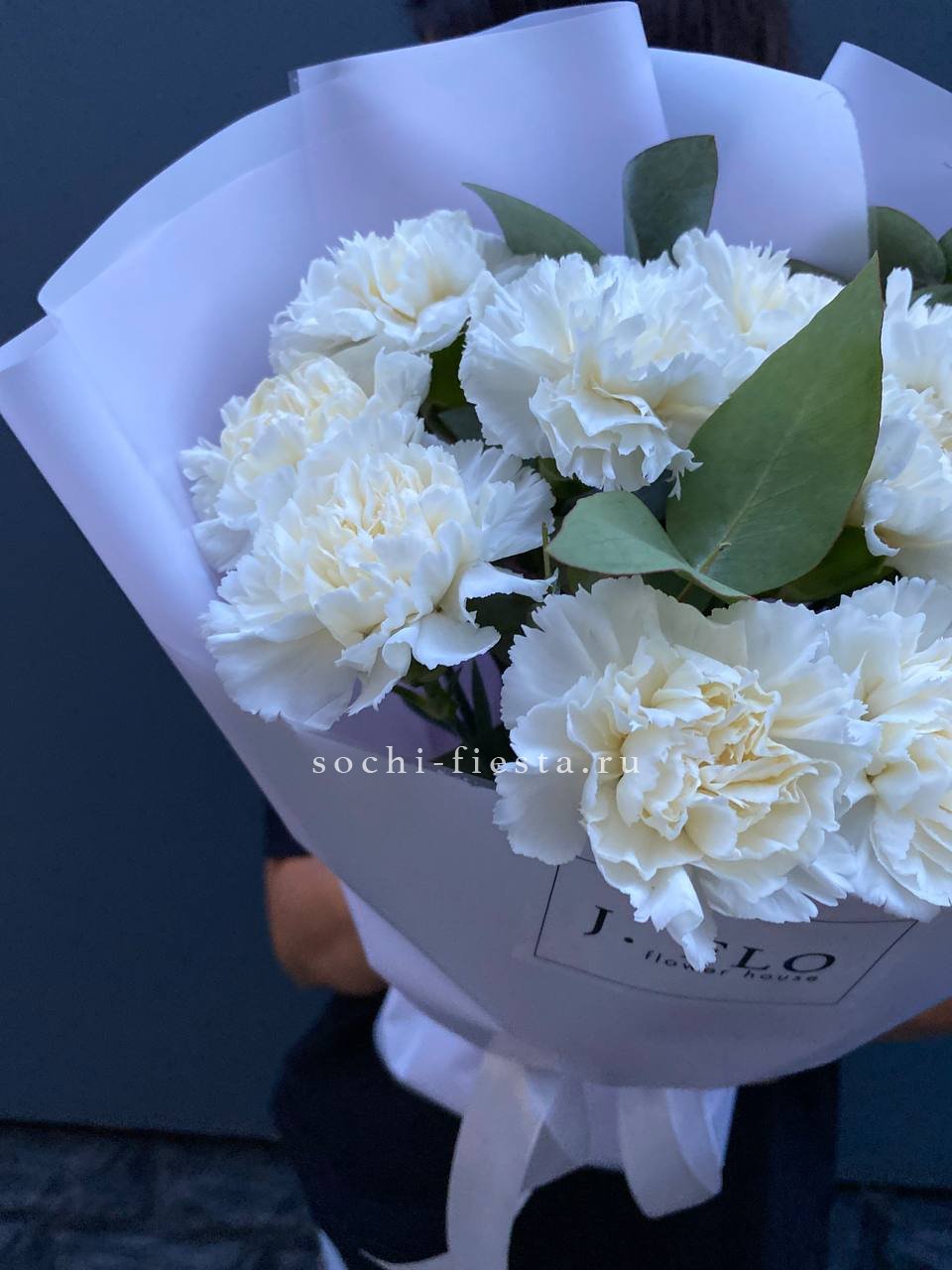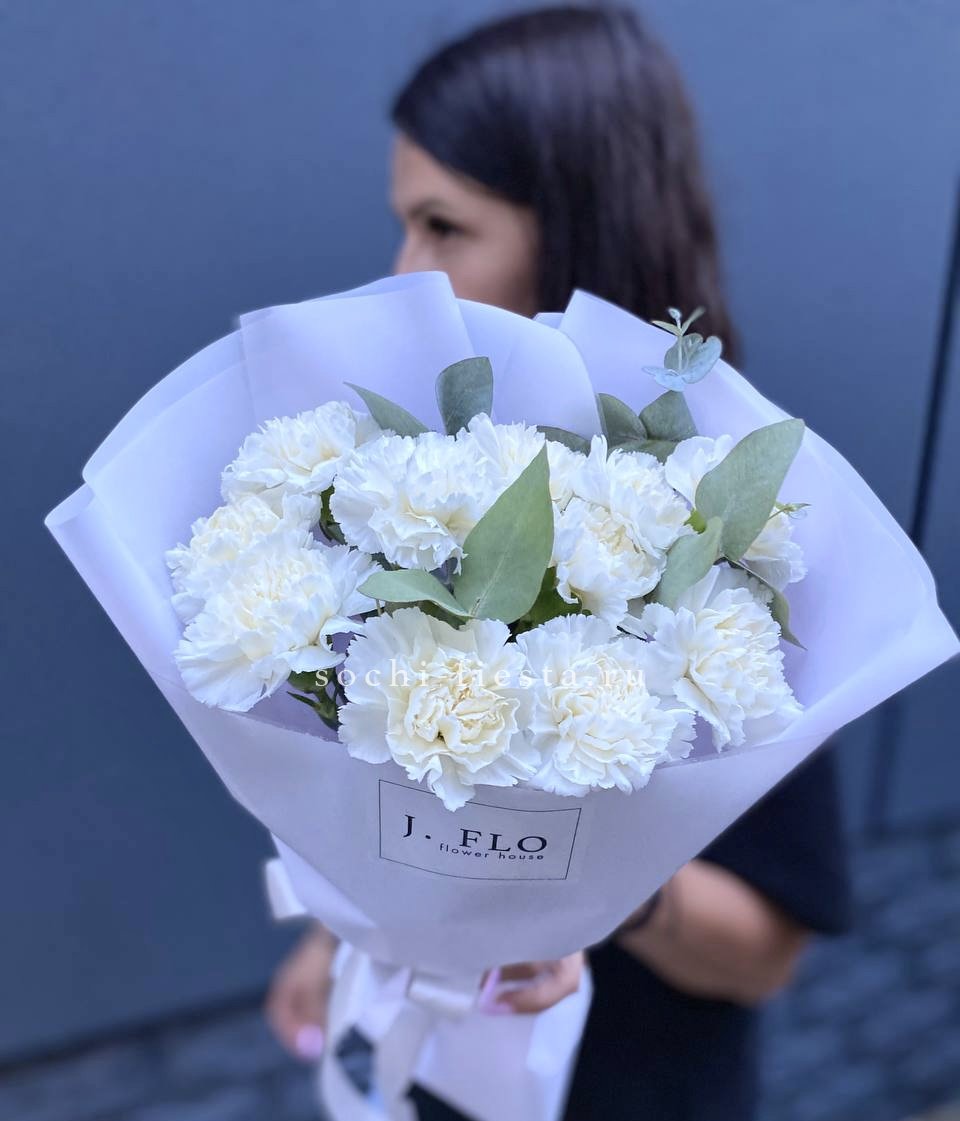 Белоснежные диантусы с пышными лепестками держат форму и долго сохраняют свежесть. Серебристый эвкалипт разбавляет плотность бутонов и добавляет прохладные нотки в композицию.