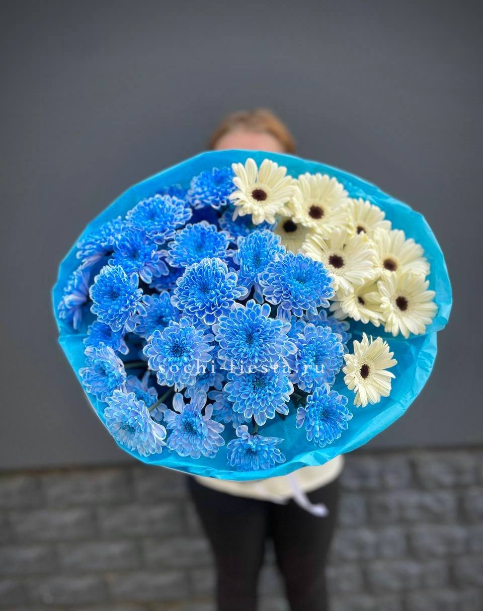 Яркие герберы и пышные хризантемы собраны в жизнерадостную композицию. Букет держит форму и долго радует свежестью, удобно размещается в любой вазе и не требует сложного ухода.