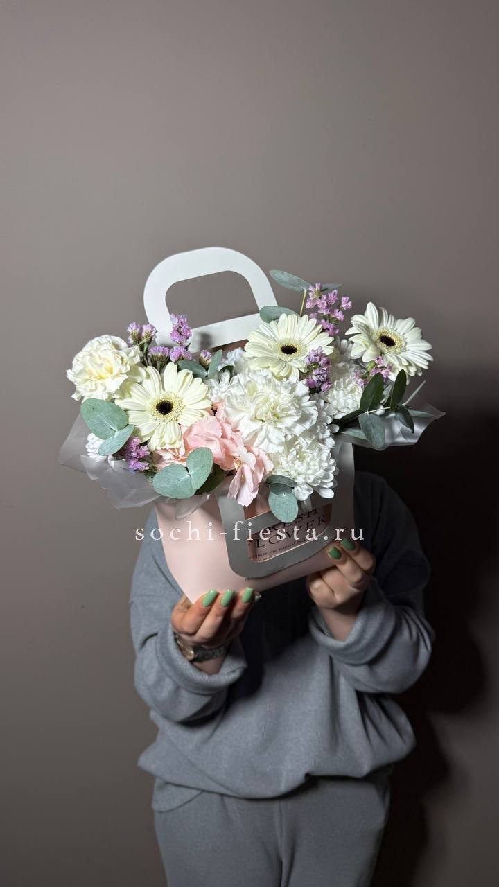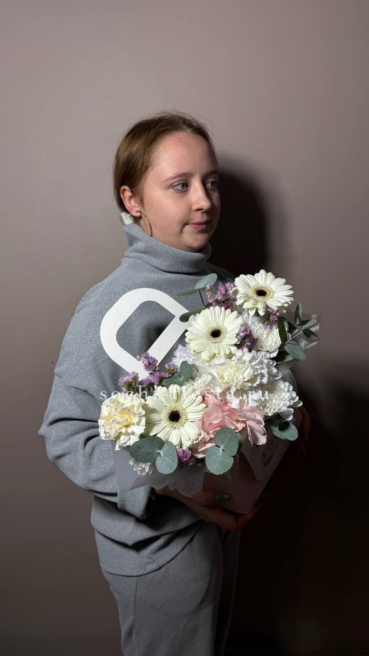 Погрузитесь в облако нежности и аромата! Этот восхитительный букет объединяет пышные шапки хризантем, изысканные бутоны лилий и свежий эвкалипт. Сочетание текстур и деликатных оттенков белого создает ощущение легкости и свежести. Это идеальный подарок для выражения самых светлых и теплых чувств, который растопит любое сердце и наполнит дом чудесным запахом.