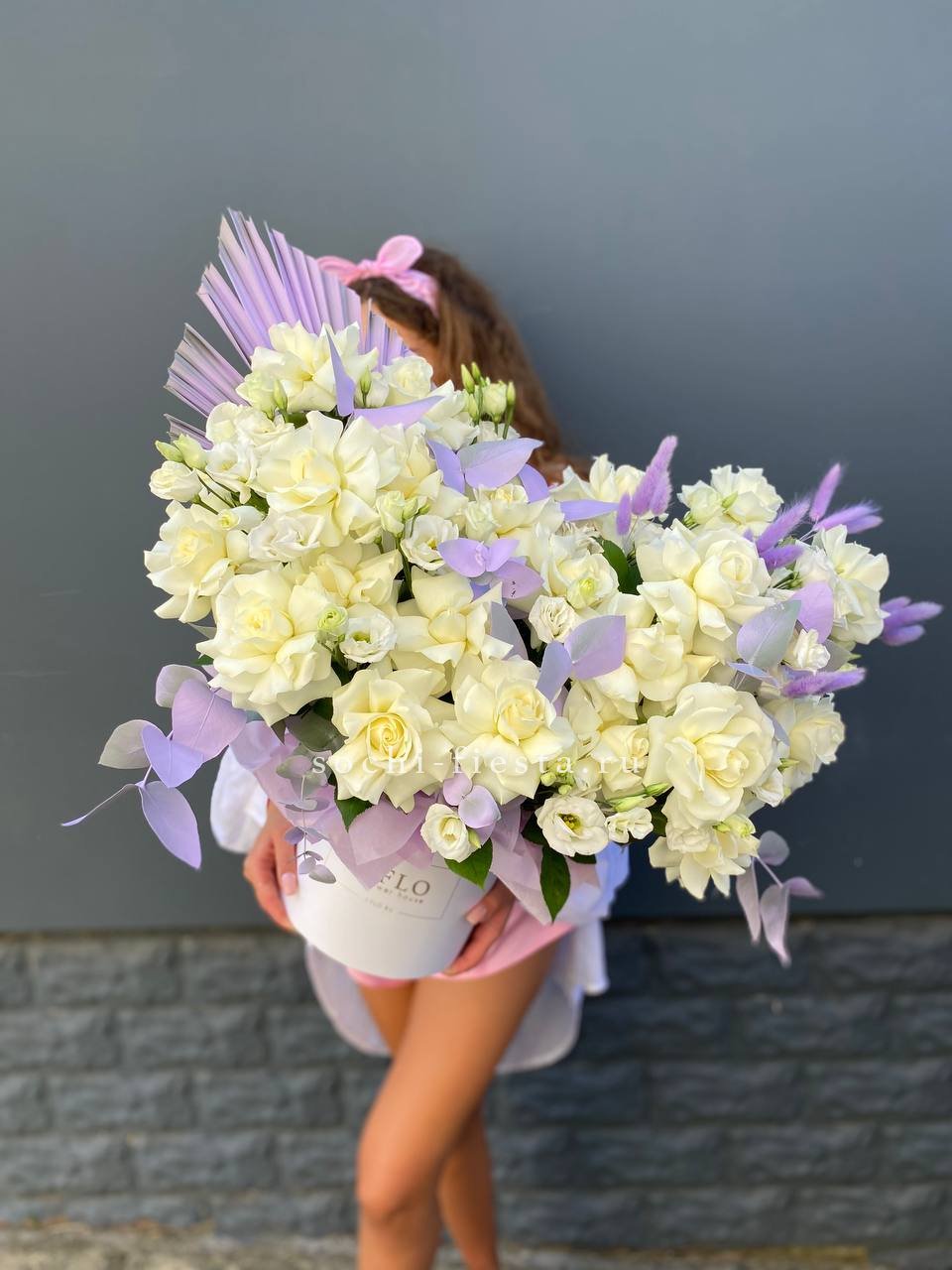 Этот букет — словно облако нежности и мечтательности. Бутончики кустовых роз, напоминающие тугие шарики, имеют светлый кремовый цвет с легким розовым оттенком. В сочетании с веточками свежего эвкалипта они создают атмосферу легкости и романтики. Это идеальный подарок для выражения самых светлых и теплых чувств, который растопит любое сердце.