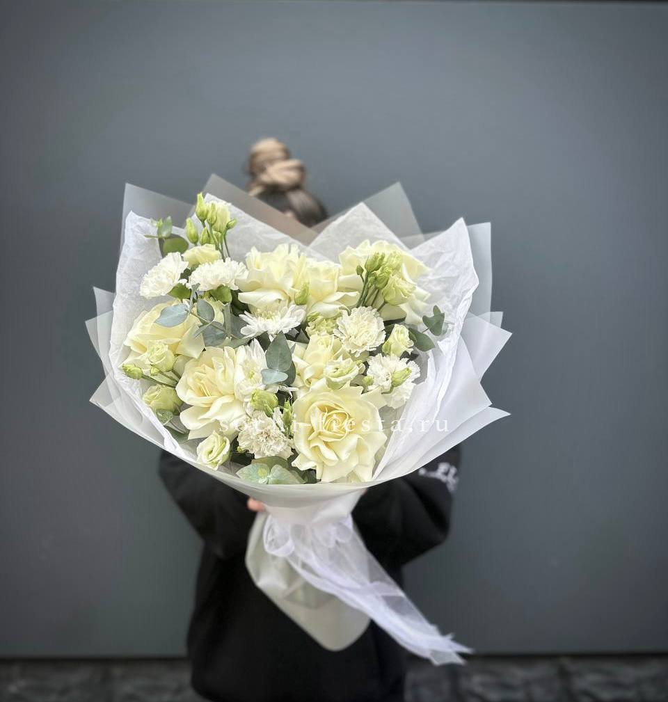 Белые розы и эустома раскрываются полными бутонами среди мелких соцветий диантуса и хризантем. Свежая зелень эвкалипта добавляет композиции глубину и завершённость.