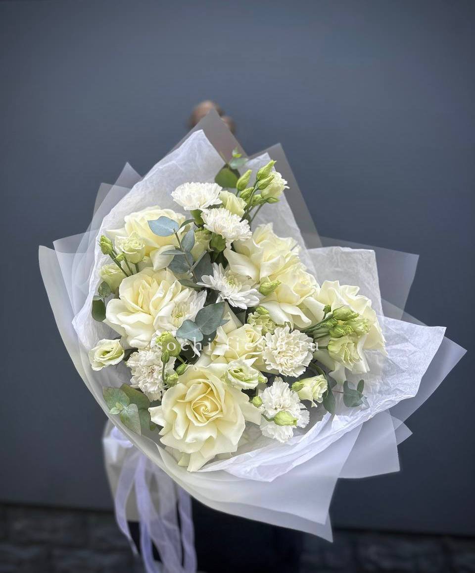 белые розы, диантус, хризантема кустовая, эустома, эвкалипт, лента, авторское оформление.