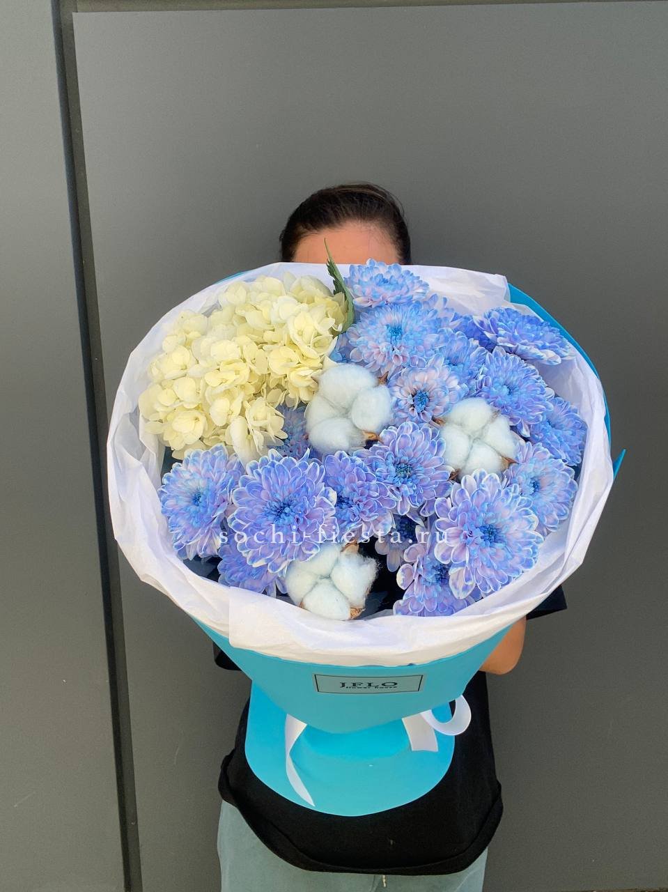 розы, гортензия, эустома, эвкалипт, дизайнерская упаковка.