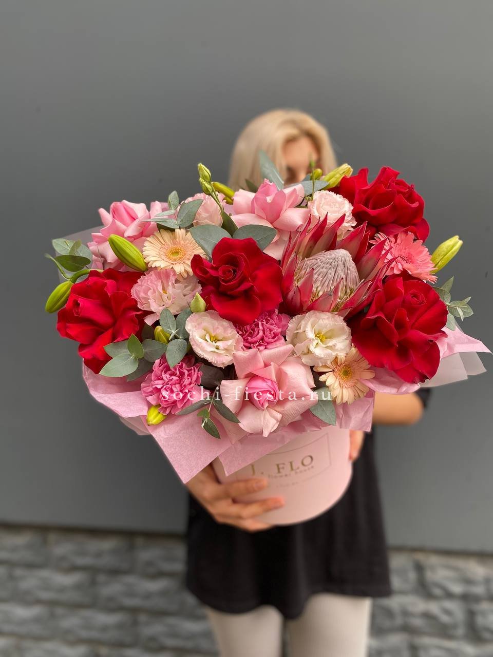 Розы и гортензия формируют объемную текстуру, где каждый бутон раскрыт по-своему. Эустома заполняет пространство между крупными соцветиями, а эвкалипт обрамляет композицию мягкой зеленой волной.
