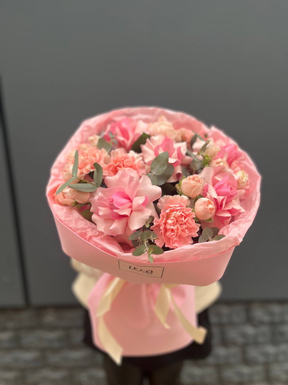 маттиола, розы, гортензия, диантусы, хризантемы , лента и дизайнерская пленка.