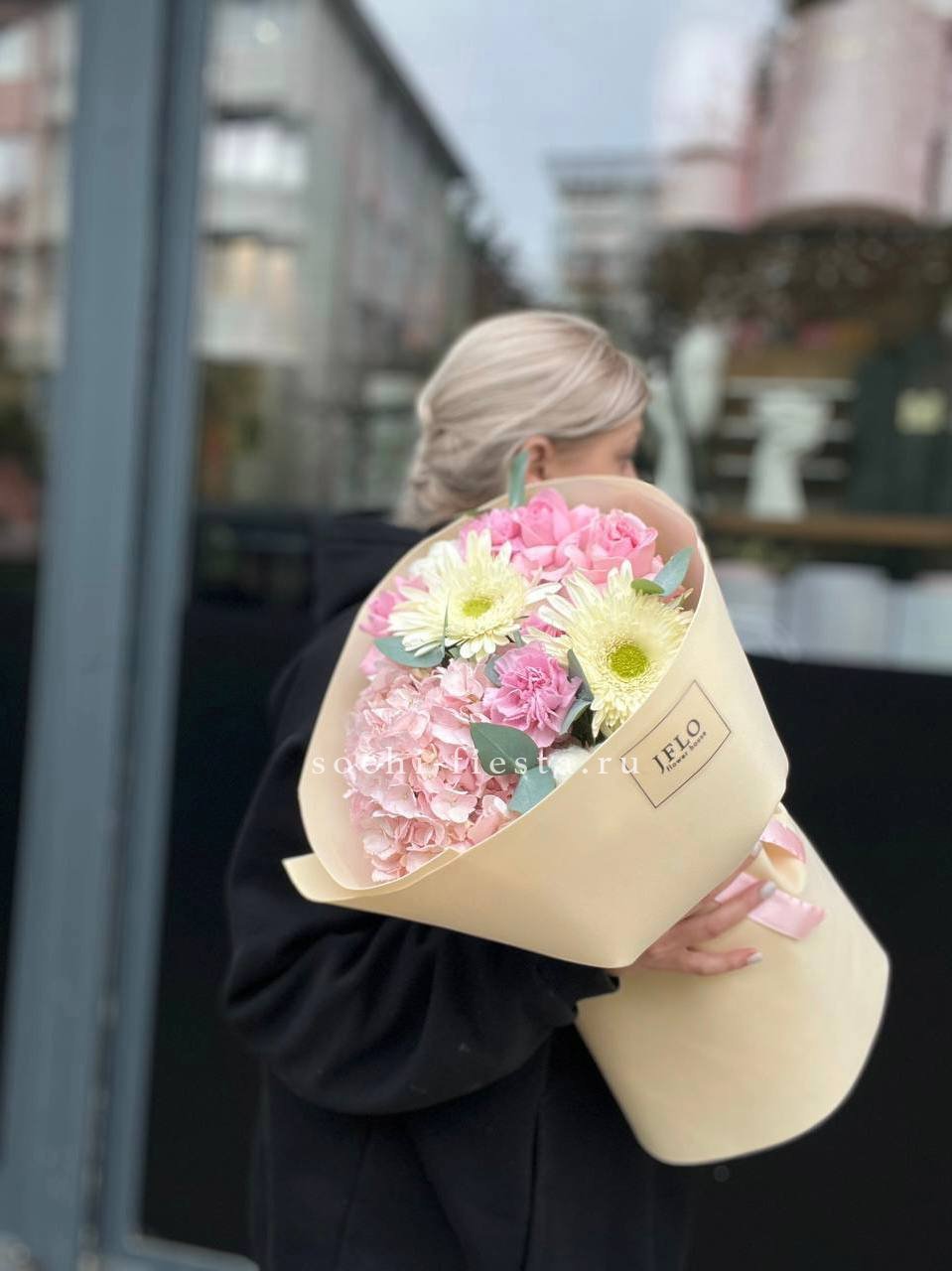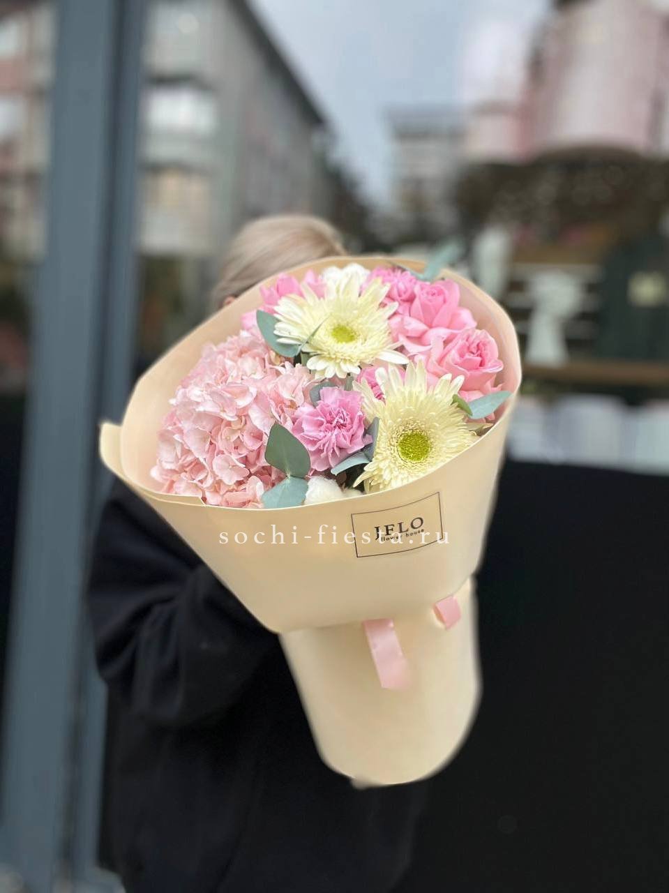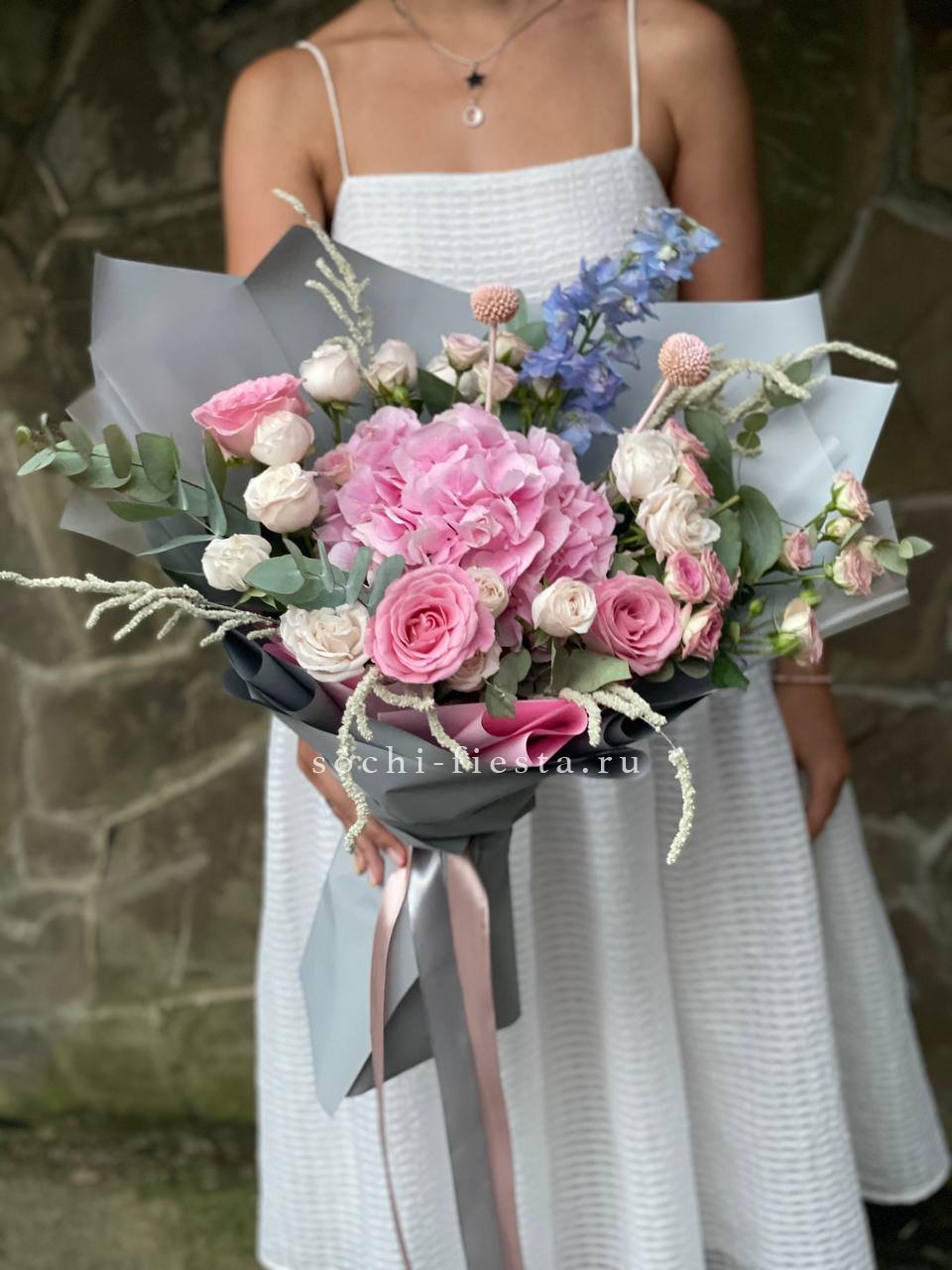 гортензия, розовые розы, диантусы, эустома, маттиолы, эвкалипт лента и дизайнерская пленка.
