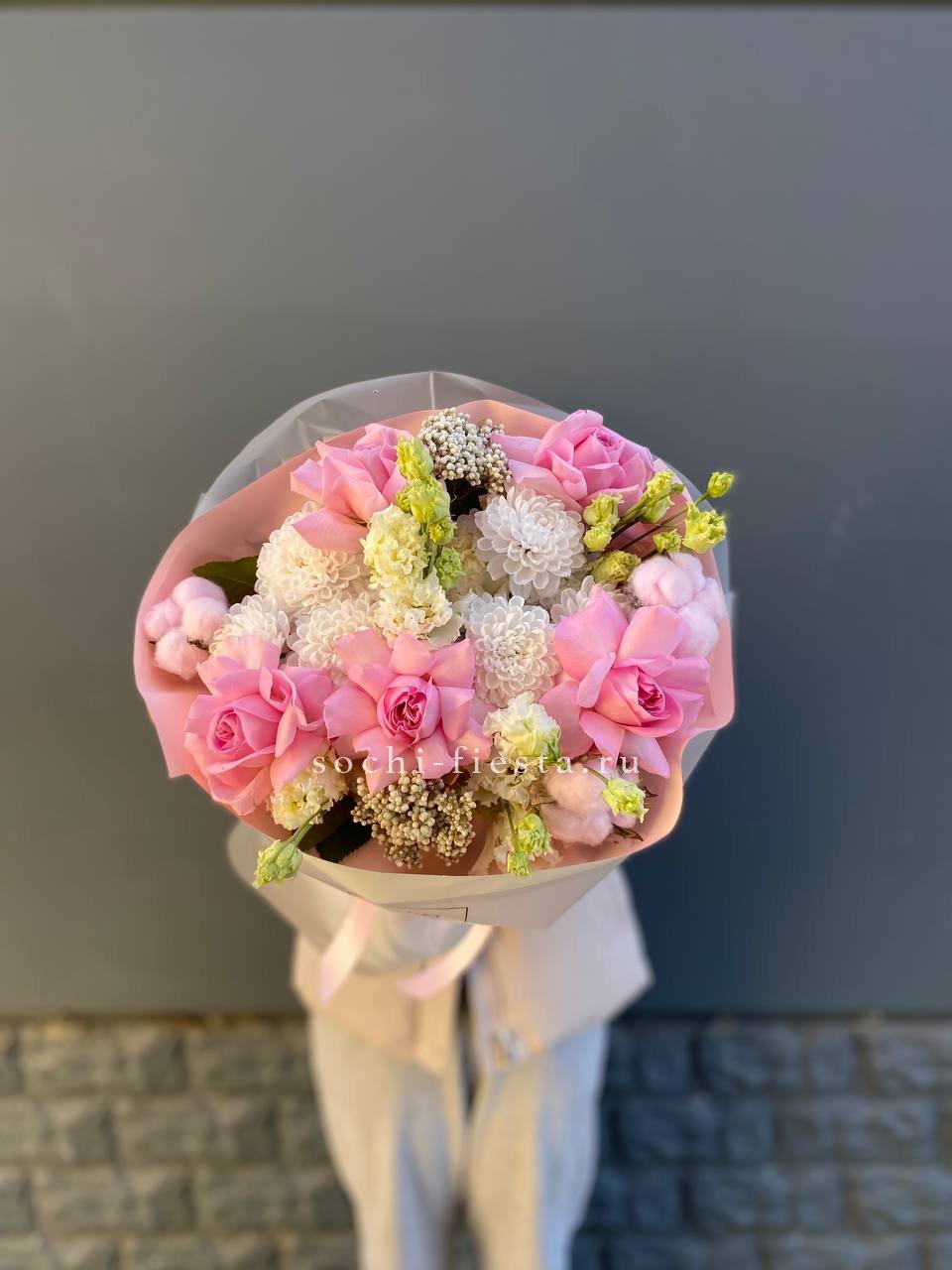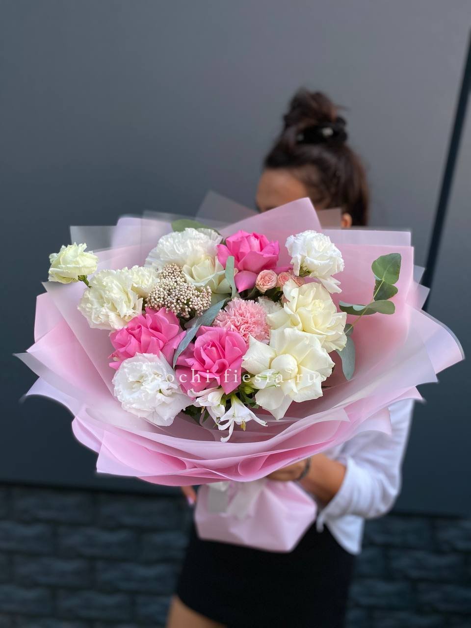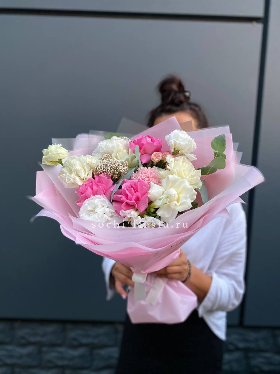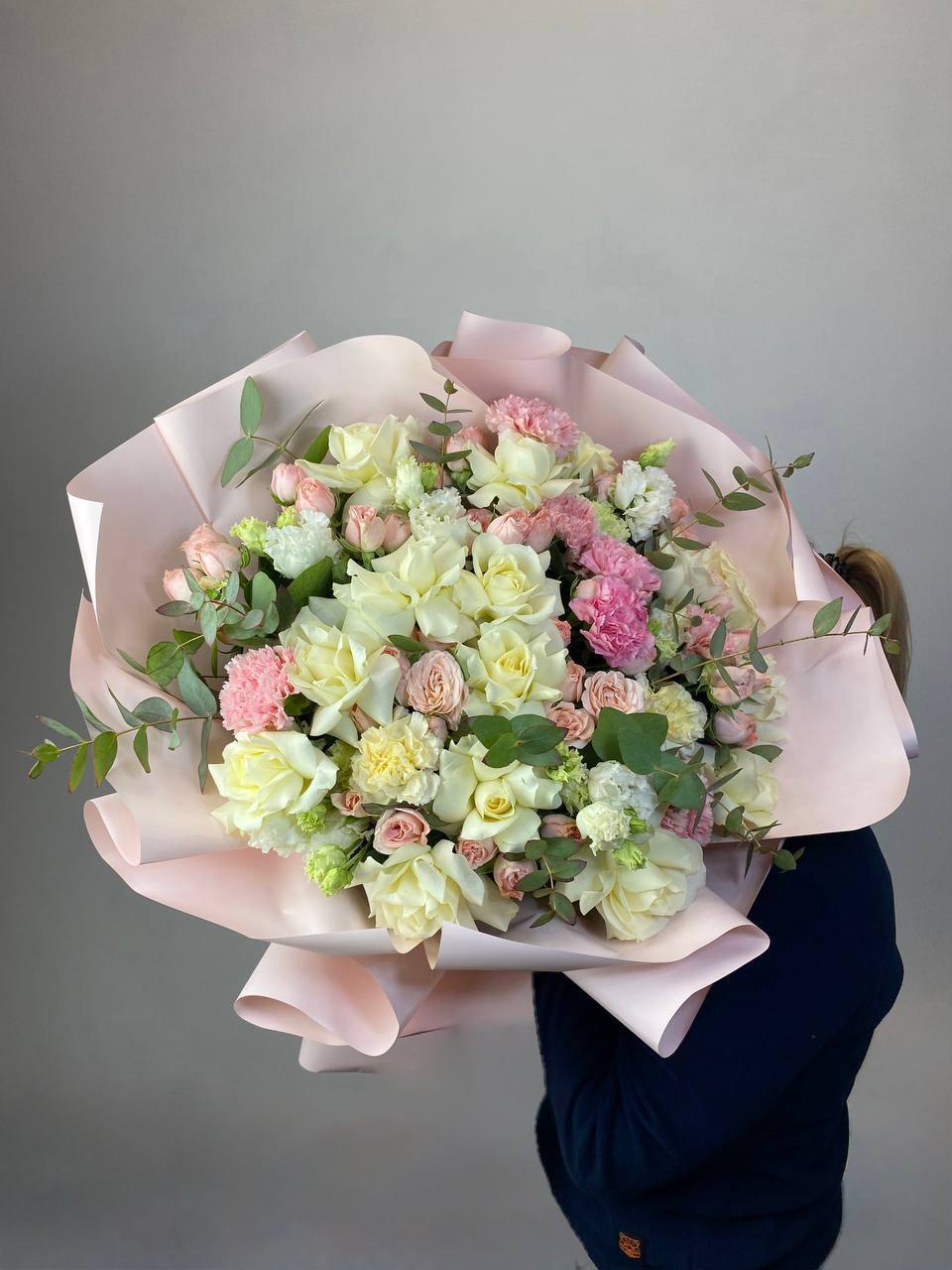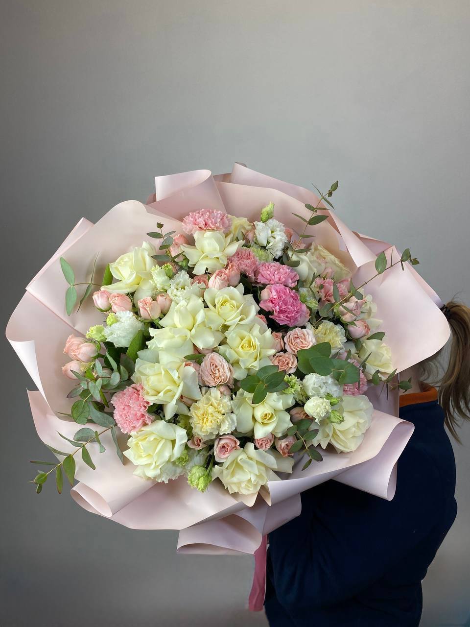 Белые розы и эустома образуют воздушный объем, где каждый бутон дышит свободно. Диантус добавляет графичности, а эвкалипт создает прохладную дымку по краям. Букет для тех, кто ценит легкость и современную флористику.