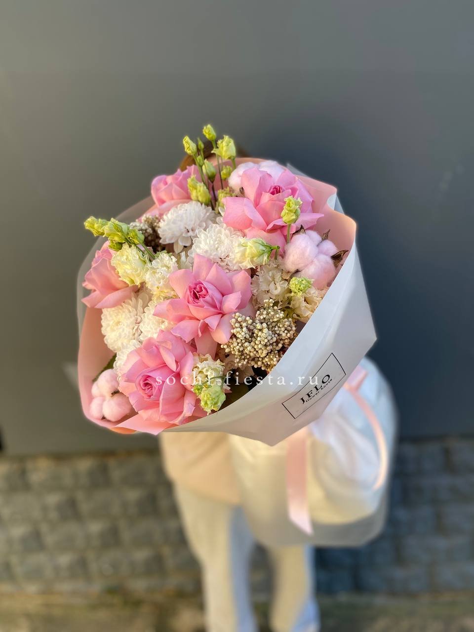 диантус, бомбастик, белые розы, эвкалипт, эустома, упаковка.