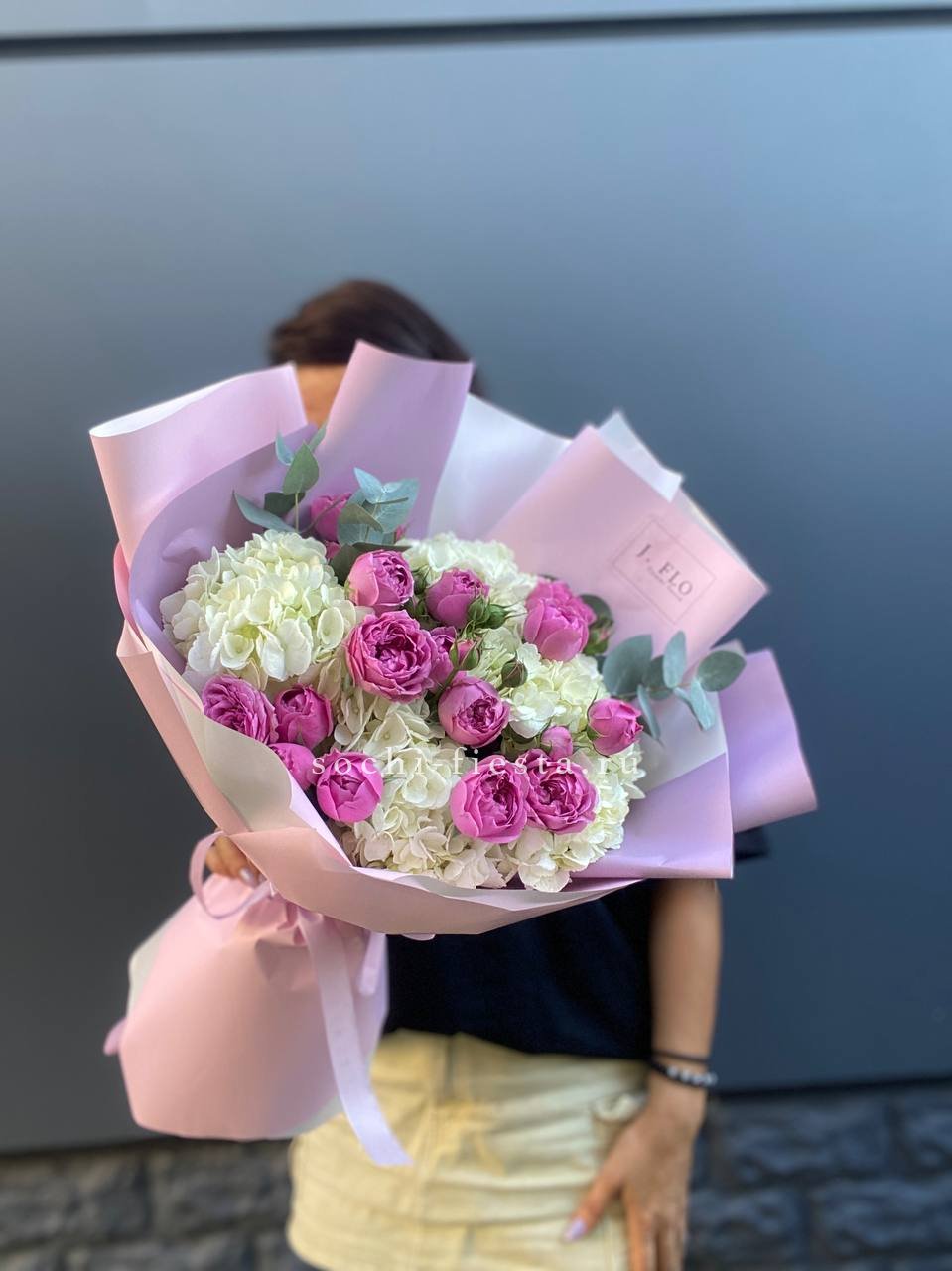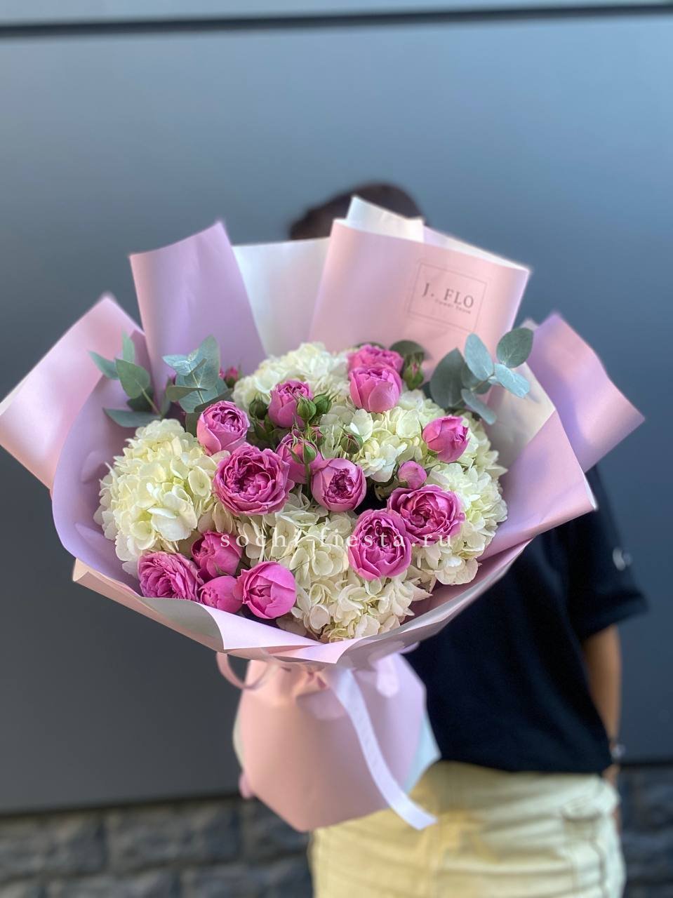 Пышные шапки гортензии создают воздушный объём, а белые розы добавляют графичности. Букет держит форму и легко размещается в любом пространстве.