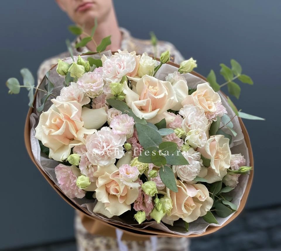 кремовые розы, эустомы (тон отличается от сезона), диантус, эвкалипт, оформление.