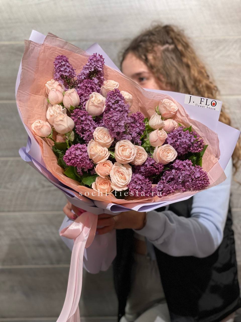пионовидная роза, сирень, дизайнерское оформление, лента.