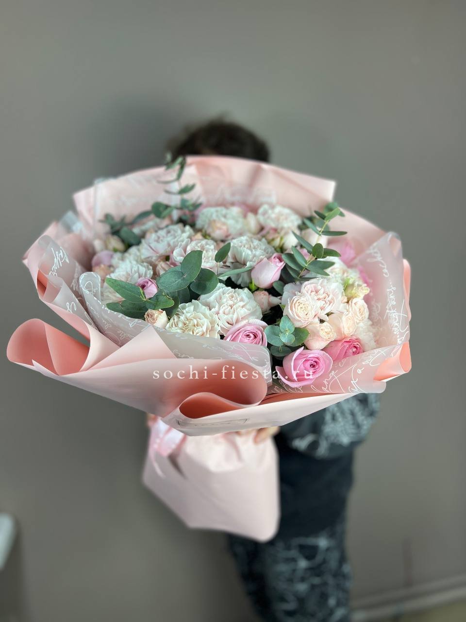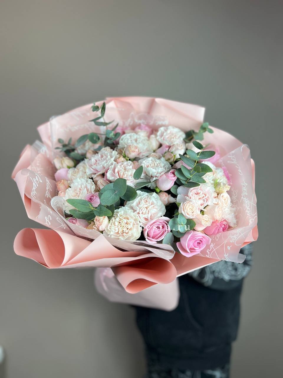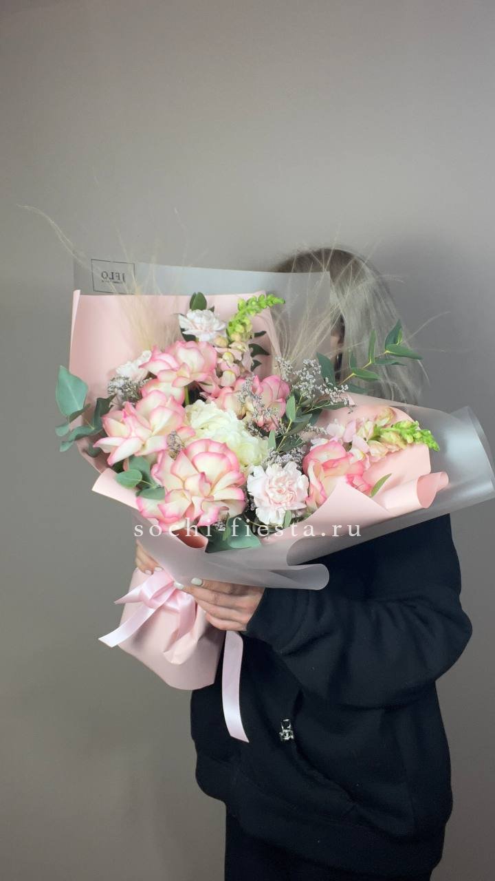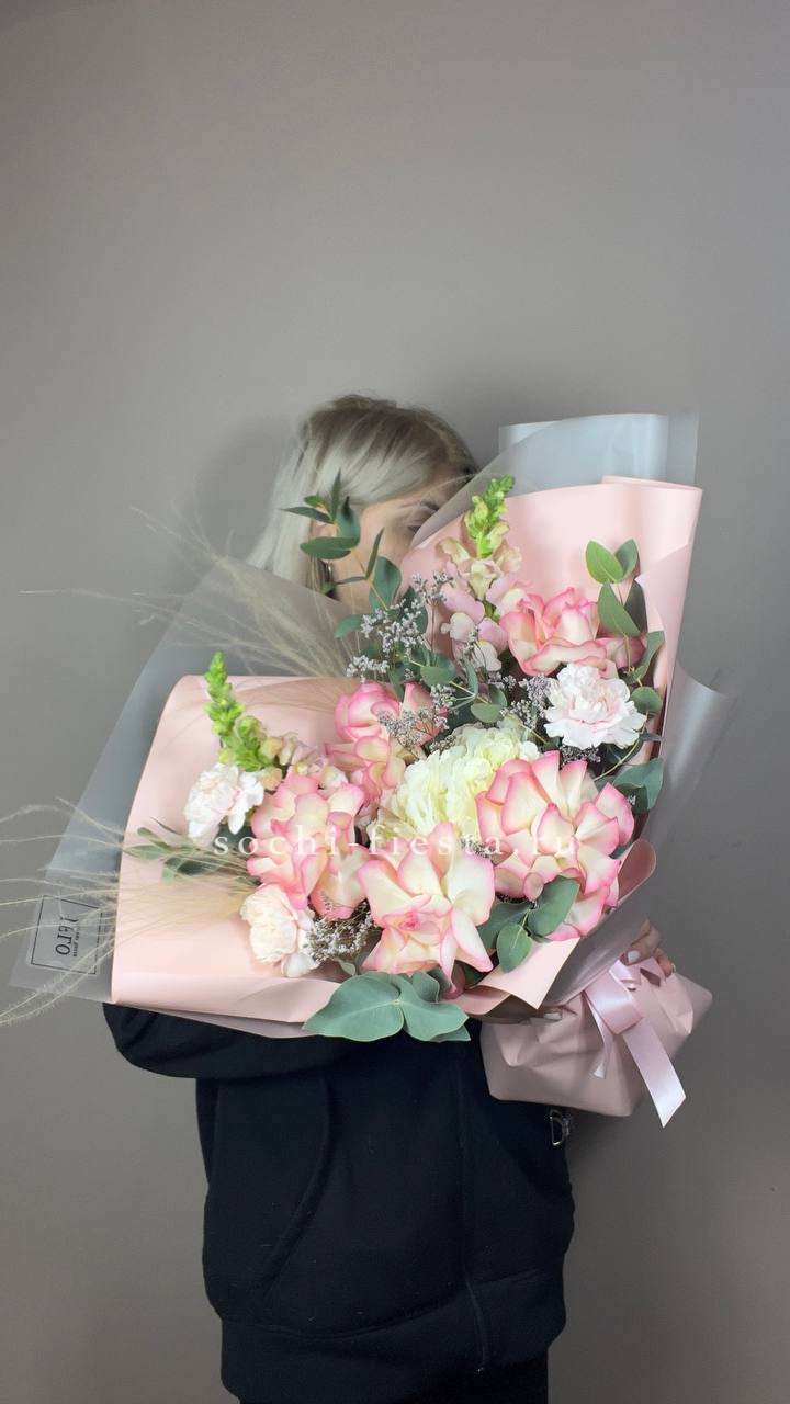 диантус, розы, бомбастик, эвкалипт, упаковка.