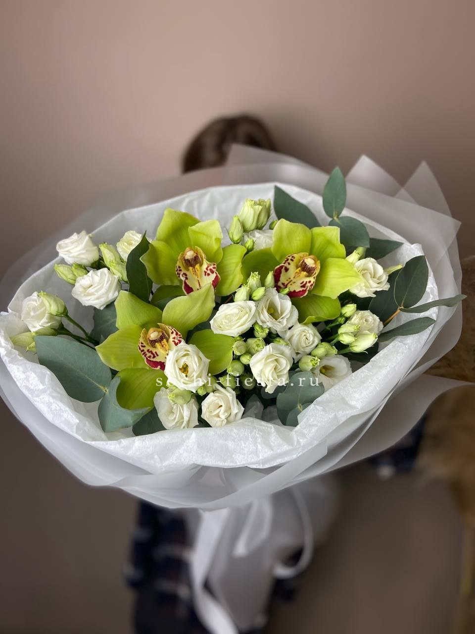эустома, орхидея цимбидиум (или эквивалент), эвкалипт,  лента, дизайнерская упаковка.