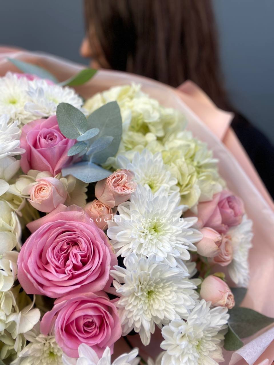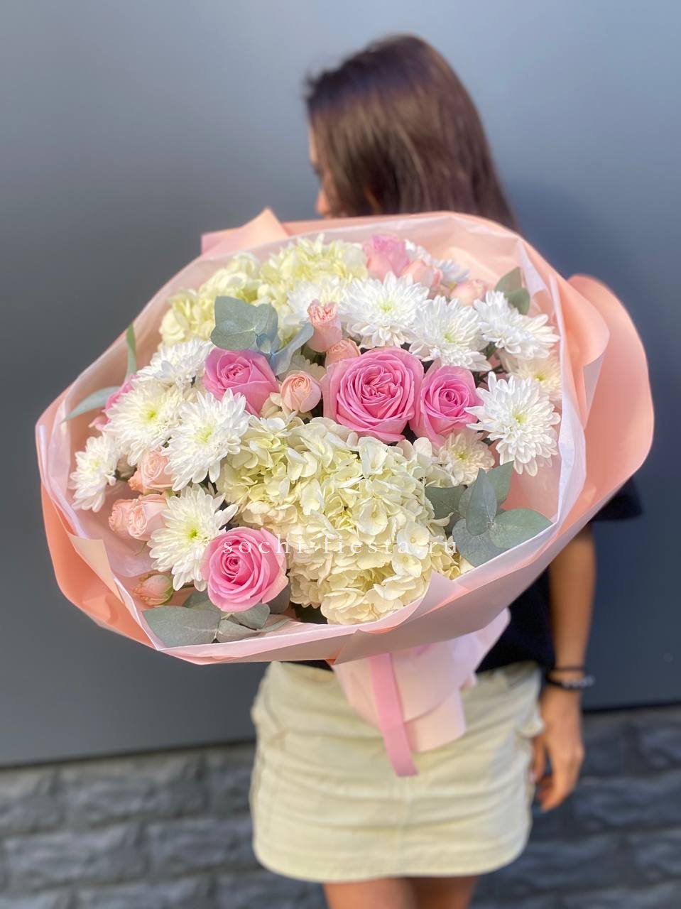 кустовые розы, гортензии, французские розы, диантусы, эустомы, лента и дизайнерская пленка.