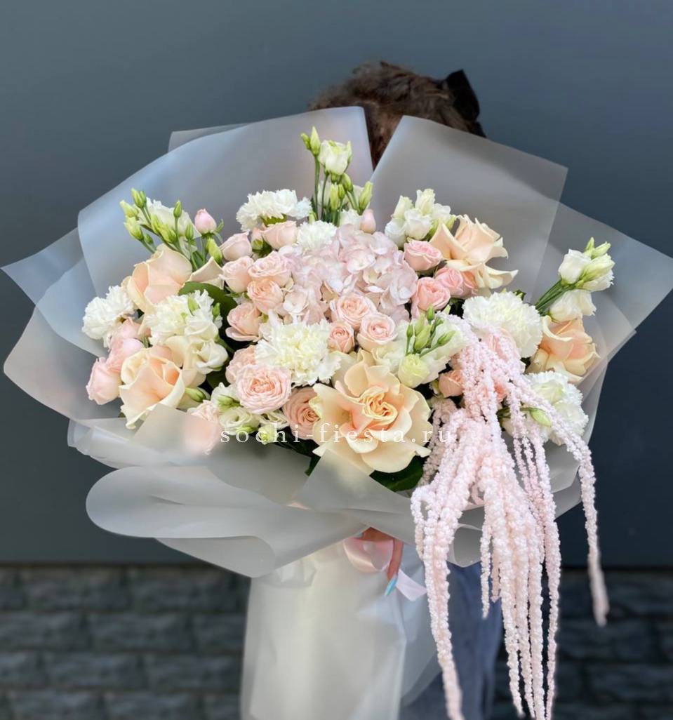 Монохромная палитра с многослойной структурой. Французские розы и эустомы чередуются с кустовыми бутонами, гортензии заполняют объём, а диантусы создают точечные акценты. Букет выглядит цельно и графично.