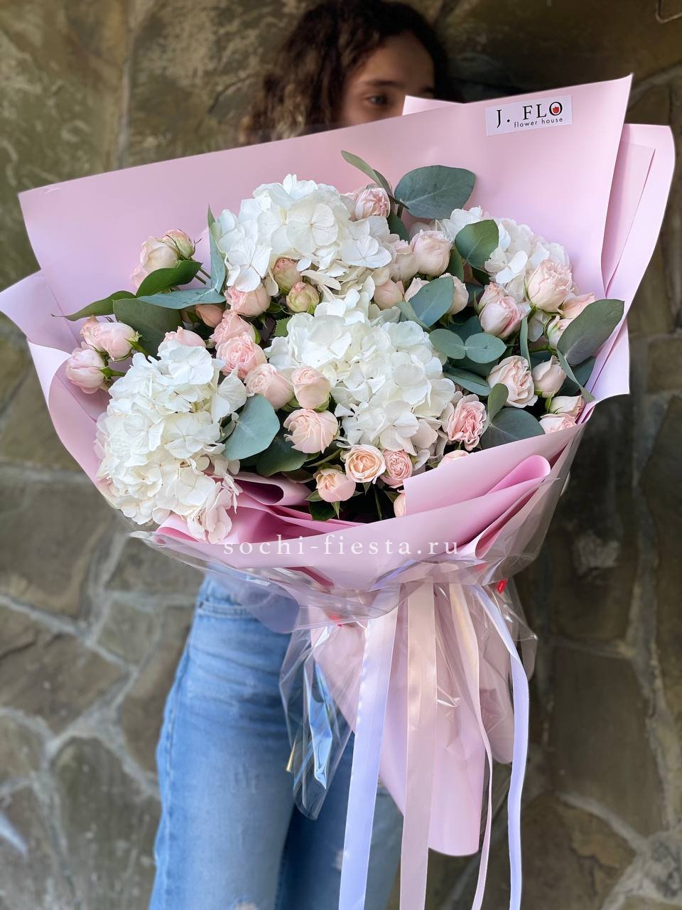 гортензия, роза, кустовая роза, диантус, эустома, дельфиниум, эвкалипт, лента, авторская упаковка.