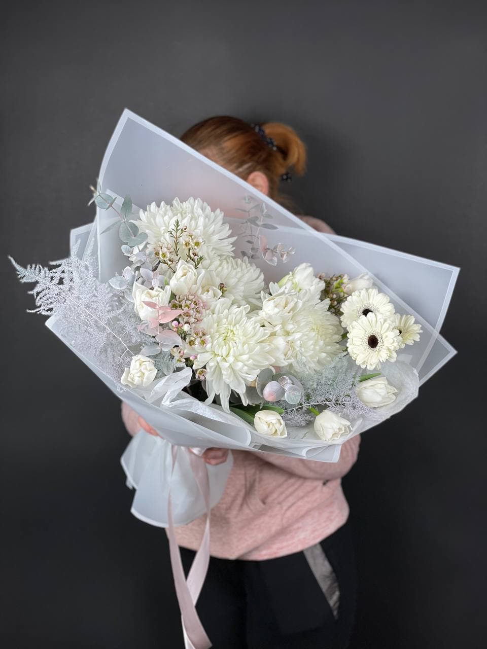 Герберы и хризантемы держат форму долго, не теряя свежести. Эвкалипт и аспарагус придают композиции завершённость, а тюльпаны или пионовидные розы вносят сезонную нотку в структуру букета.