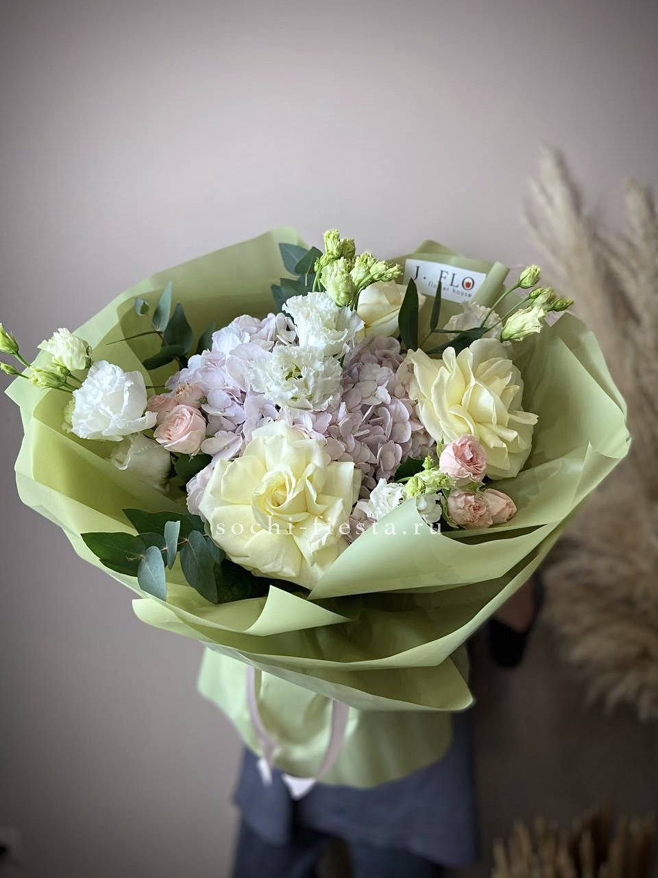 Этот пышный авторский букет напоминает нежное зефирное облако, в котором гармонично сочетаются объемные формы и изысканные оттенки. Композиция представляет собой микс из крупных соцветий гортензии и кустовых роз в пастельной гамме.