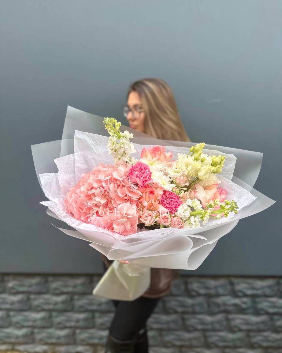 Пышные шапки гортензии и густые бутоны пионовидных роз в розовой гамме. Пампасная трава привносит текстурный акцент и делает композицию объёмной.