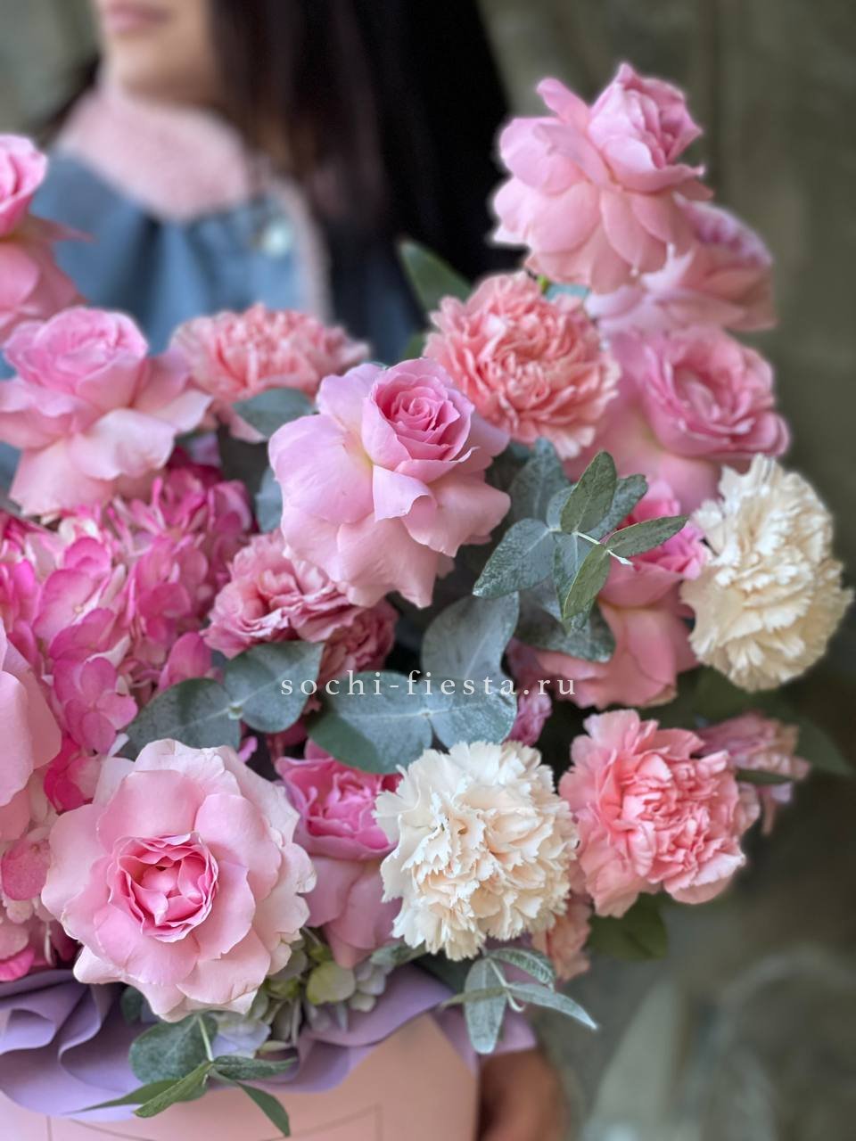 Пышная гортензия задает объем, а французские розы и эустома создают многослойную глубину. Диантусы добавляют графичные точки, эвкалипт обрамляет композицию мягкими линиями.