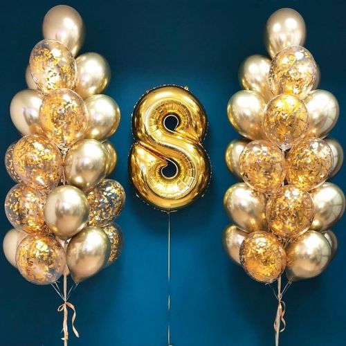 3 шт. фольгированных шара сердце розовое золото (без надписи), 3 шт. латексных нежно-розовых шара, 3 шт. хромированных золотых шаров, 2 шт. хромированных розовых шаров, грузик. Все шары мы предварительно обрабатываем специальным составом Highfloat, обеспечивая им длительный срок полета.