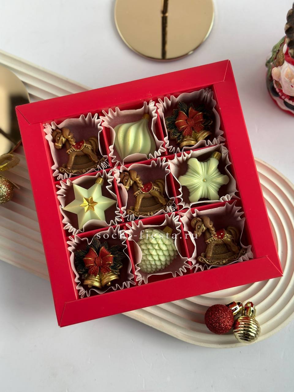 Девять шоколадных игрушек с ручной росписью: миниатюрные лошадки и колокольчики из бельгийского шоколада. Каждая фигурка прорисована вручную и готова украсить праздничный стол или стать частью новогоднего настроения.