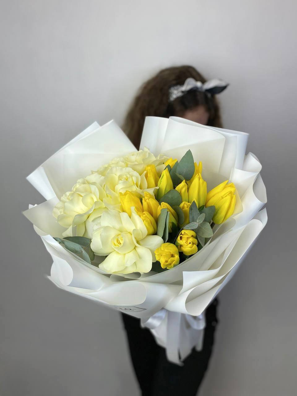 жёлтые тюльпаны, розы, эвкалипт, пленка.