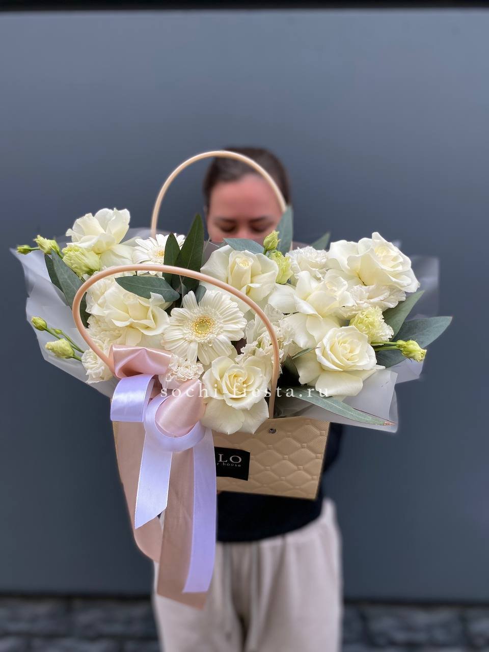 Яркие герберы задают ритм всей композиции, белая роза и эустома добавляют воздуха между соцветиями. Эвкалипт создает свежий фон для этого микса в удобной сумке-кашпо.