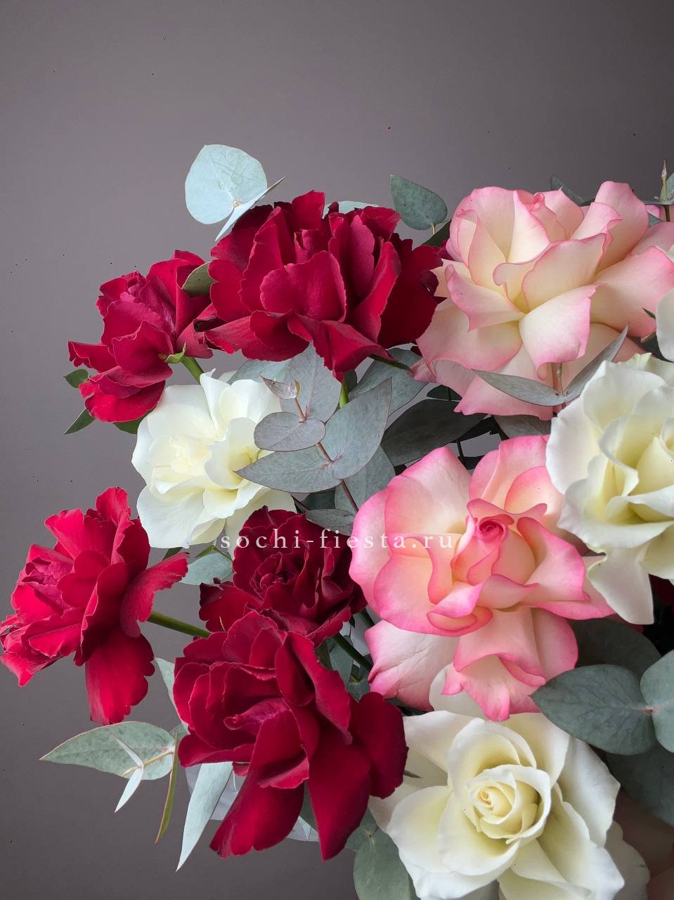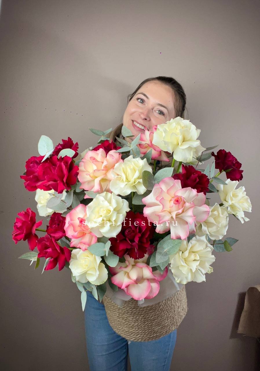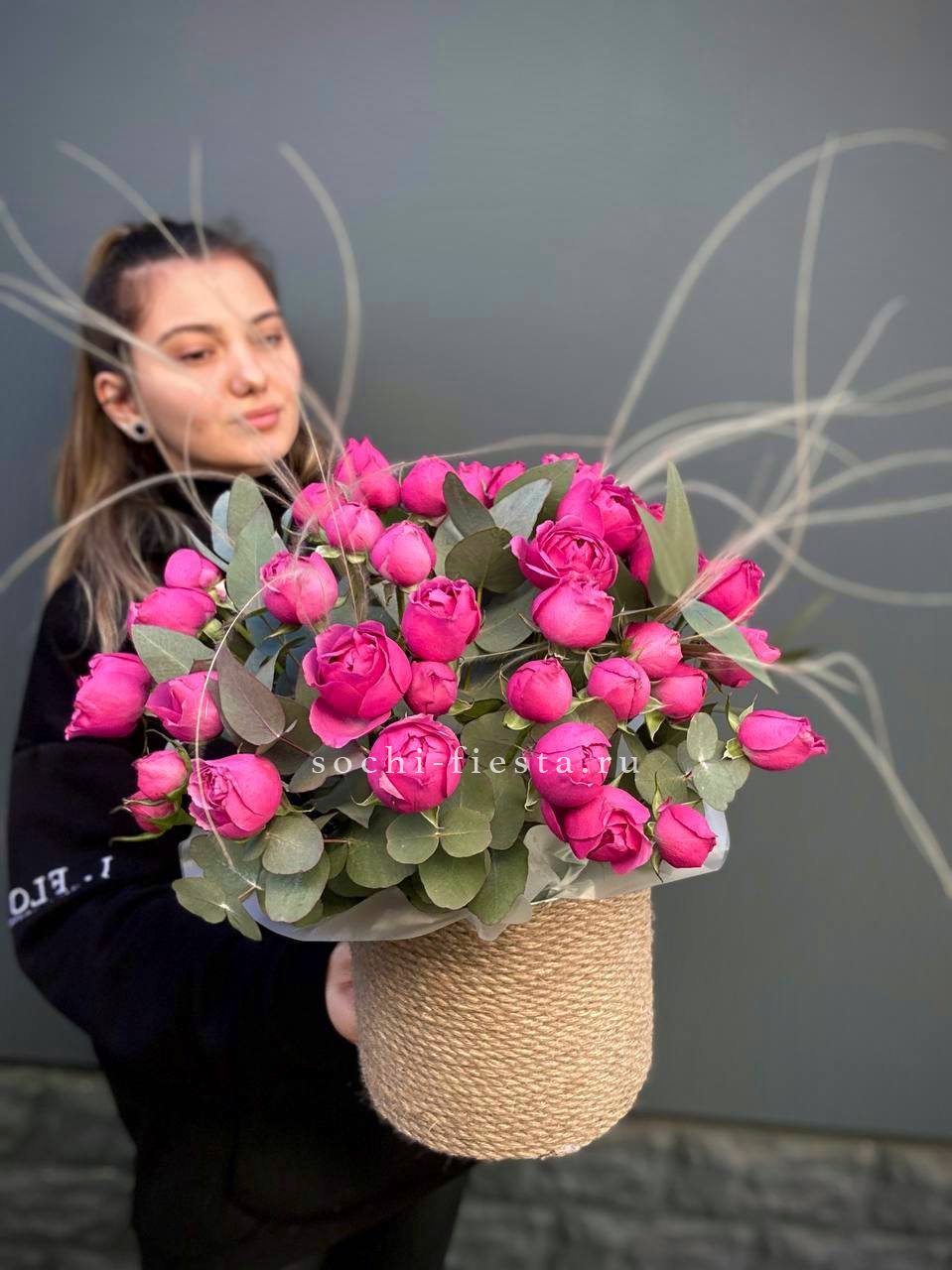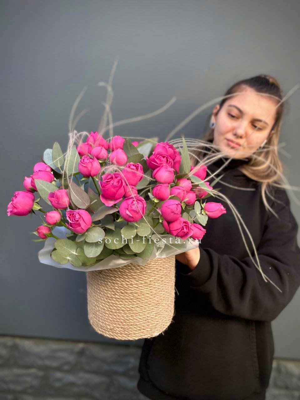 кустовые пионовидные розы Бомбастик, эвкалипт, цилиндр D13, бумага тишью, лента.