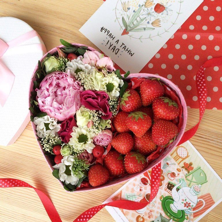 комбинация цветочных элементов нежных оттенков, клубника, коробка в форме сердца.