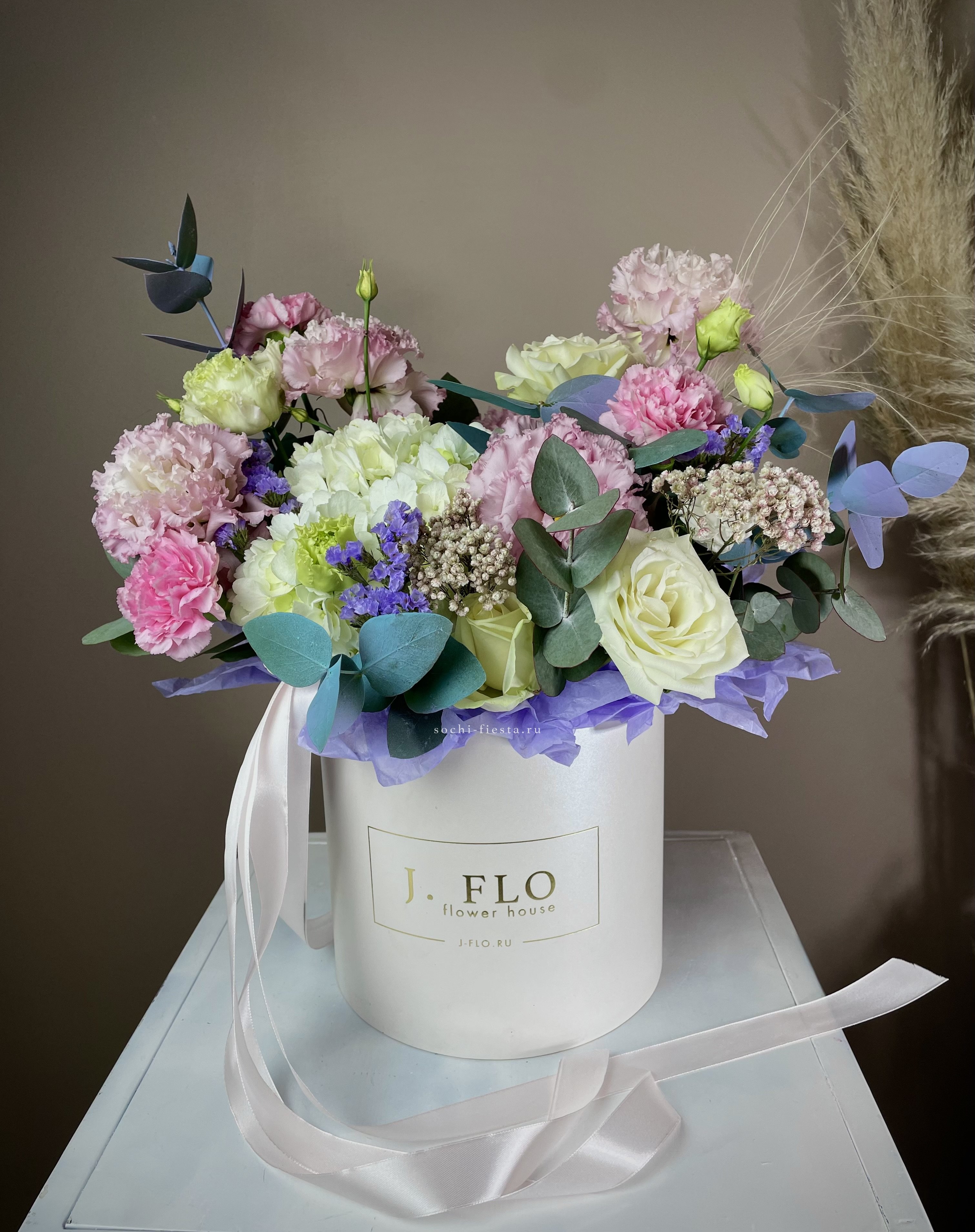 Эустомы и пионовидные розы соседствуют с французскими макарон в коробке в форме сердца. Диантусы и эвкалипт создают объём, а сладкий акцент делает композицию завершённой.