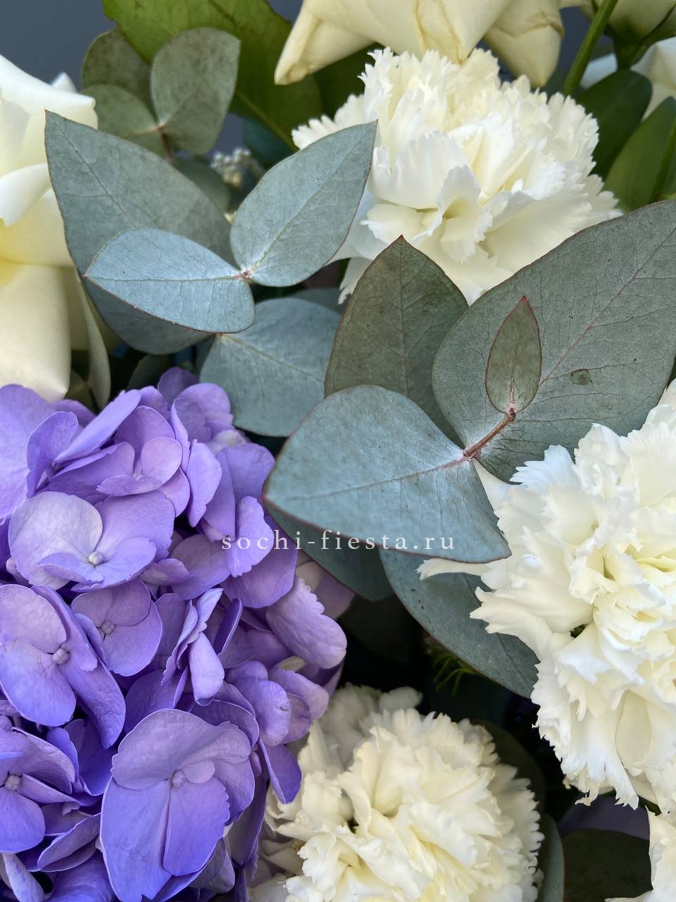 Белоснежные вывернутые розы образуют плотное облако над пастельной дымкой диантуса и эустомы. Гортензия добавляет объём и мягкость, а эвкалипт создаёт воздушную рамку вокруг композиции.