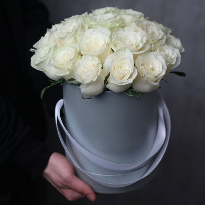 Двадцать семь бархатных роз собраны в плотную круглую композицию с серебристыми ветками эвкалипта. Шляпная коробка сохраняет свежесть и позволяет разместить цветы в любом уголке дома.