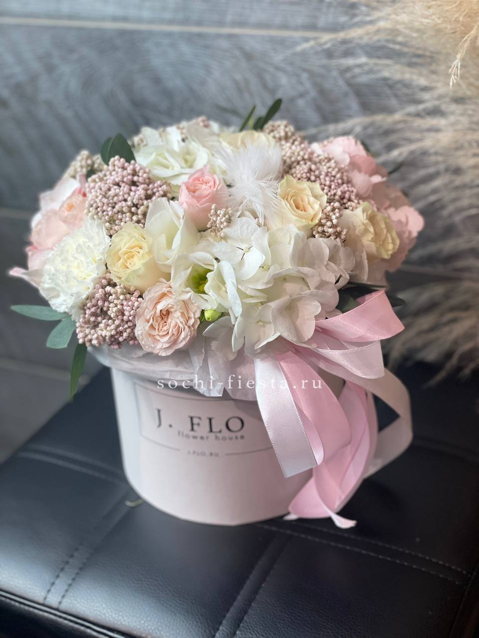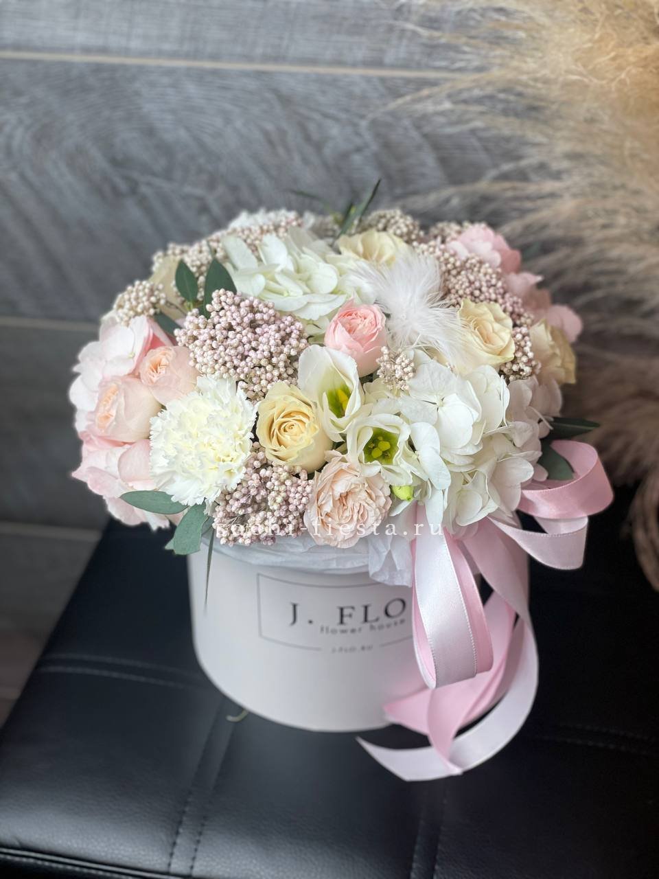 Воздушная композиция в пастельной гамме с акцентом на фактуру раскрытых бутонов. Пионовидные розы и эустома создают объёмный силуэт, а хлопок добавляет графичности.