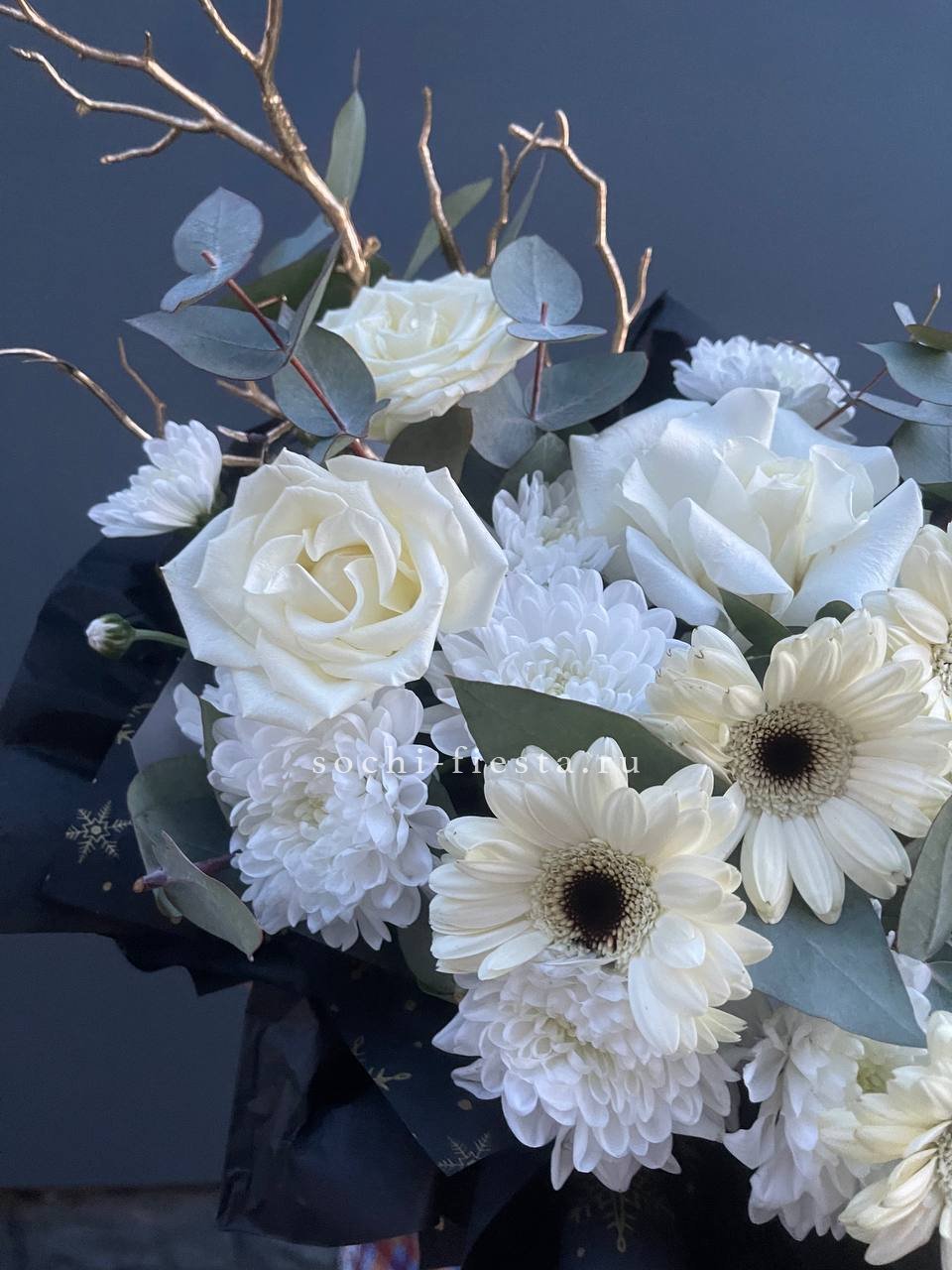 герберы, хризантемы, белые розы, бокс 16.