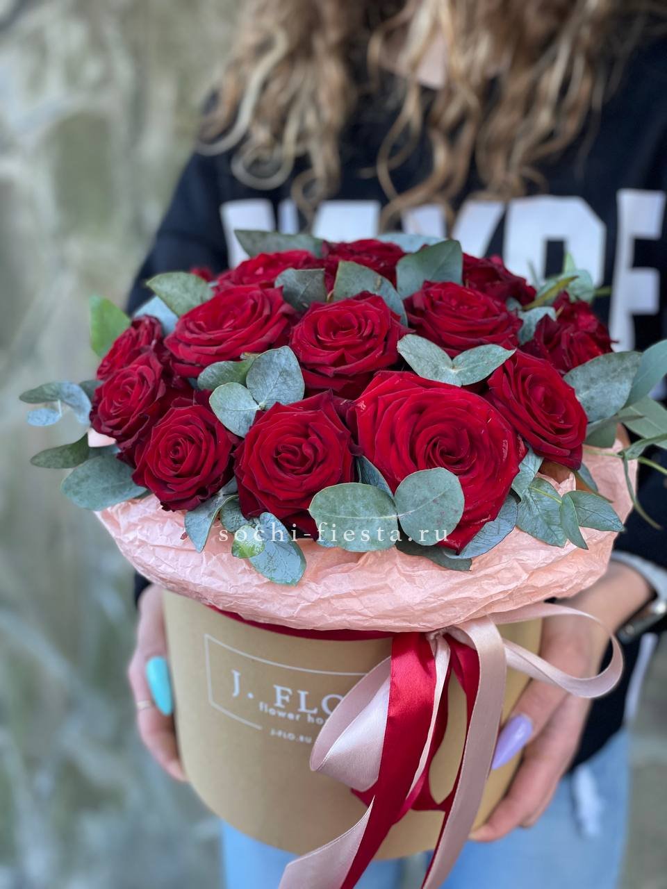Пышные головки диантуса собраны плотной шапкой в круглой коробке. Ветви эвкалипта создают воздушное обрамление. Минималистичная композиция с выраженной текстурой.