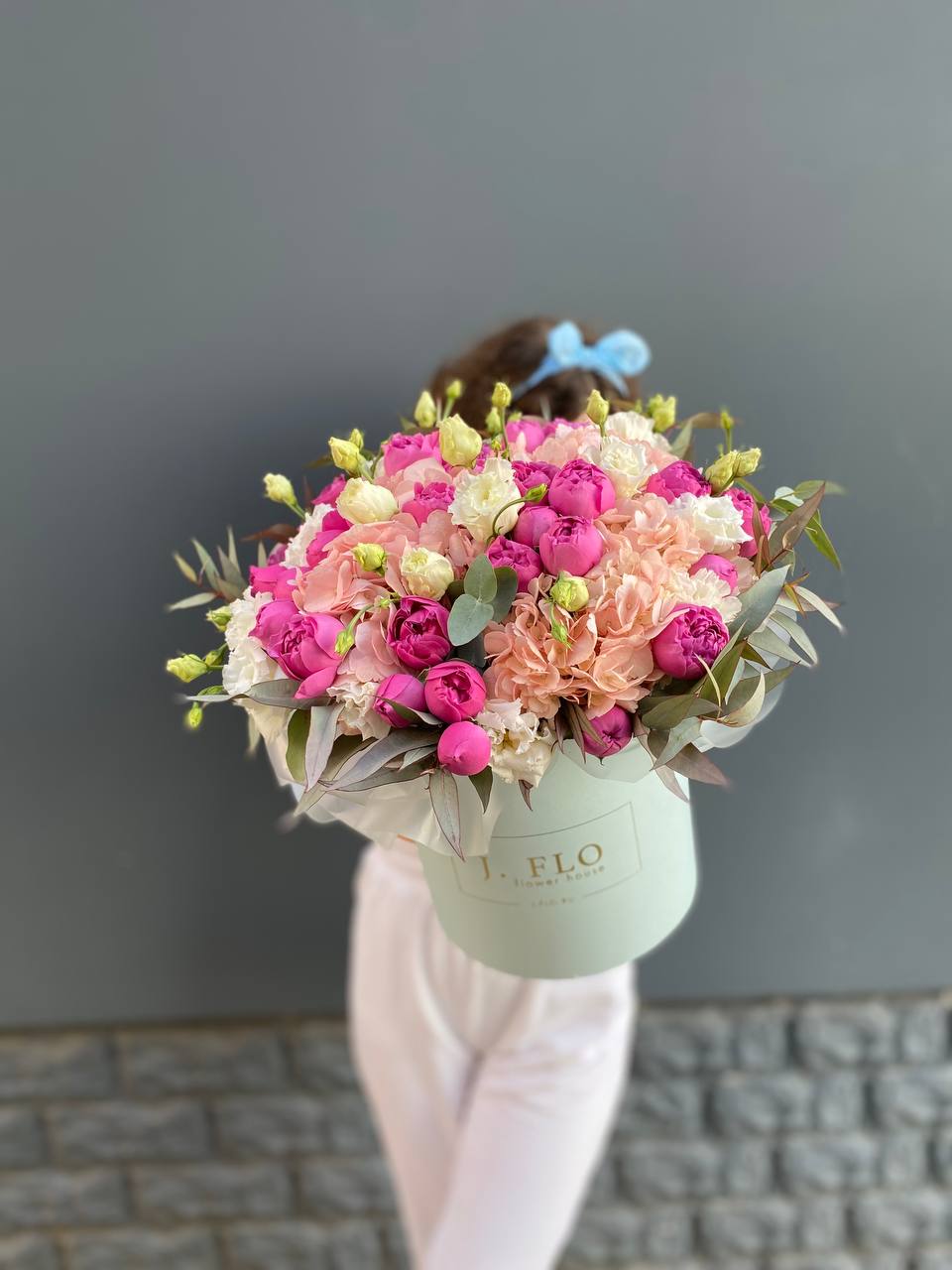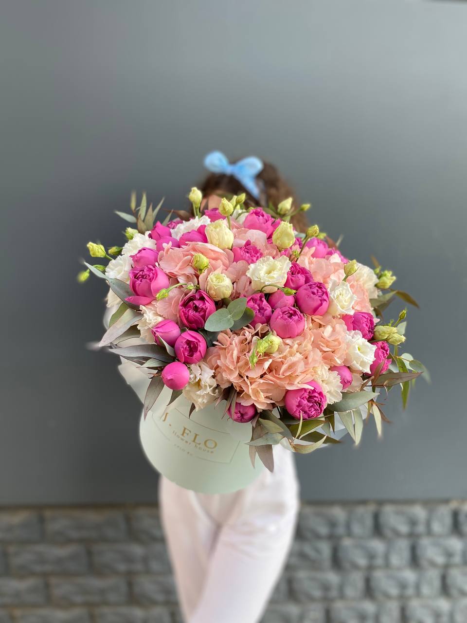 Пышные головки бомбастик наполняют круглую коробку объемом и воздушной структурой. Гортензия добавляет мягкости и завершает композицию в пастельной гамме.