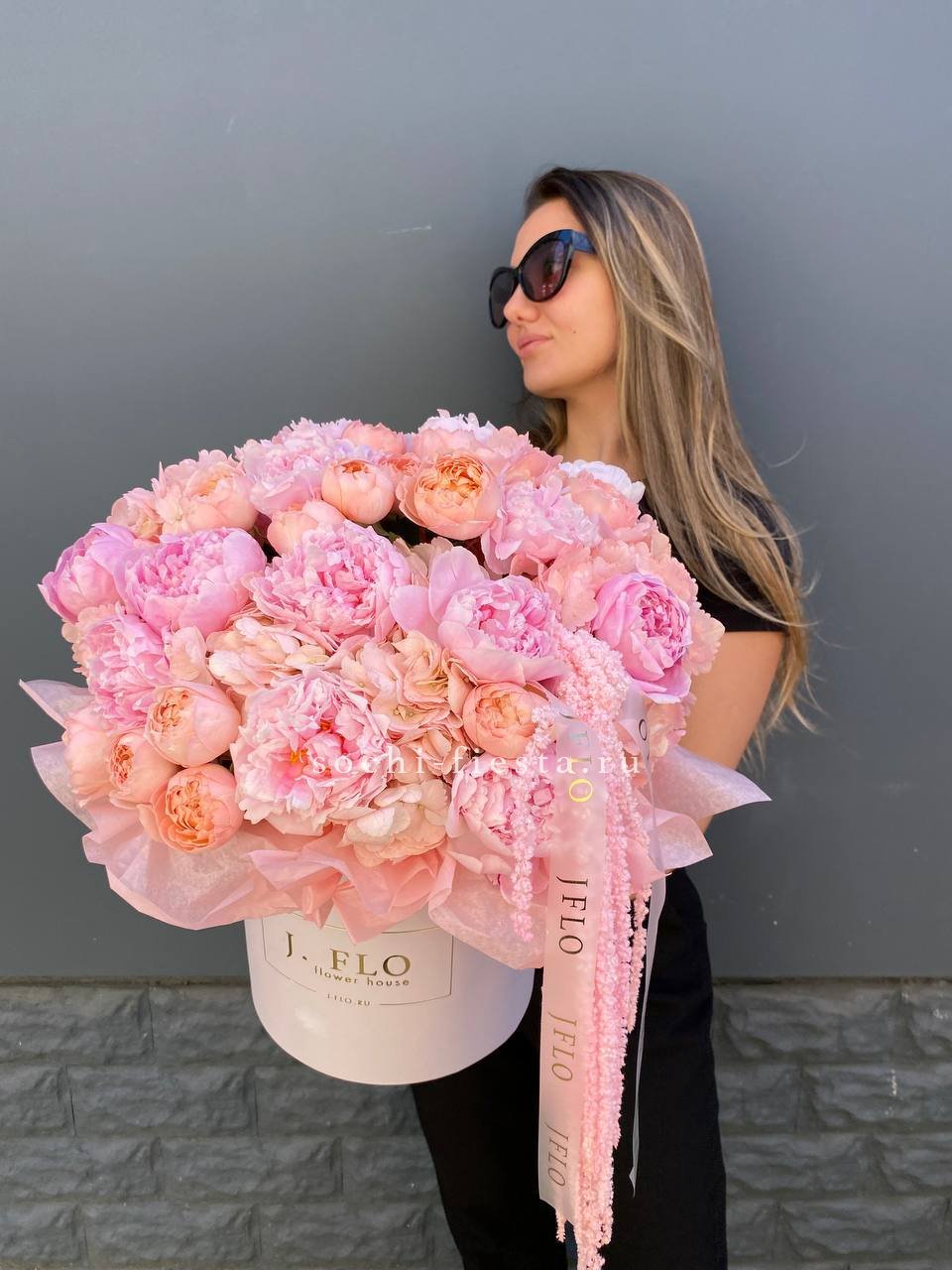Пионы и кустовые розы собраны плотно, почти без воздуха между бутонами. Гортензия добавляет объём, амарант выстраивает вертикальные линии. Композиция держит форму и не рассыпается.