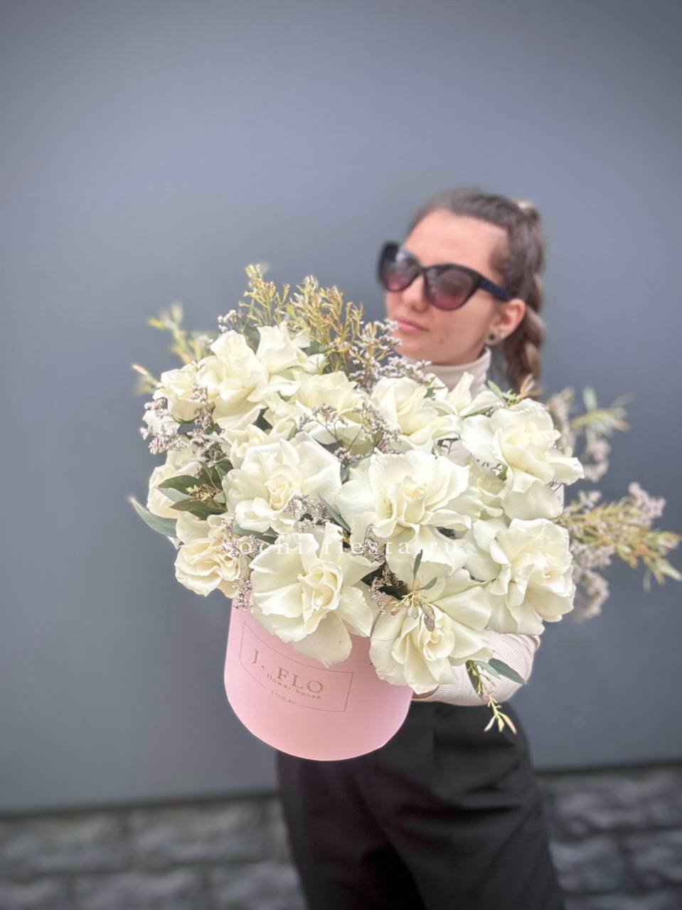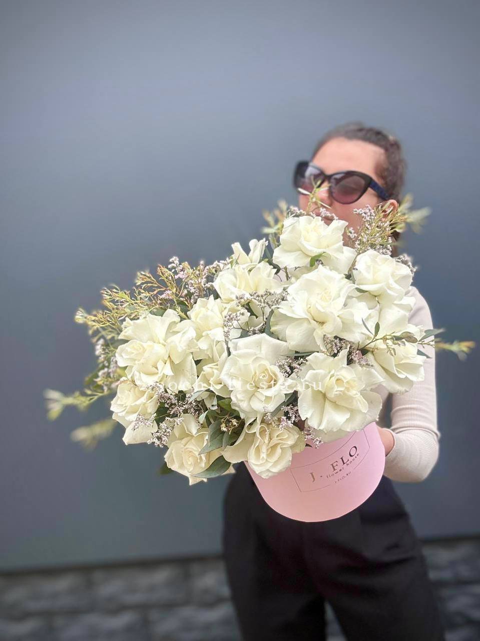 Семь веточек кустовой розы Мисти баблс собраны в круглую форму и дополнены свежим эвкалиптом. Компактная коробка с воздушной бумагой тишью сохраняет композицию аккуратной и готовой к вручению.