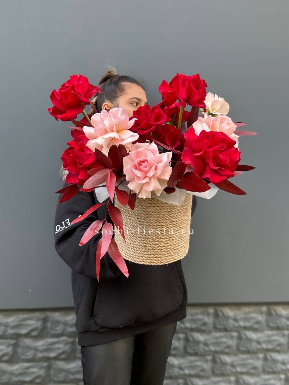 Живые гиацинты и свежие розы собраны в компактную композицию с природной текстурой джута. Корневая система сохранена, что позволяет цветам радовать дольше обычного букета. Готовое решение для дома или рабочего пространства.