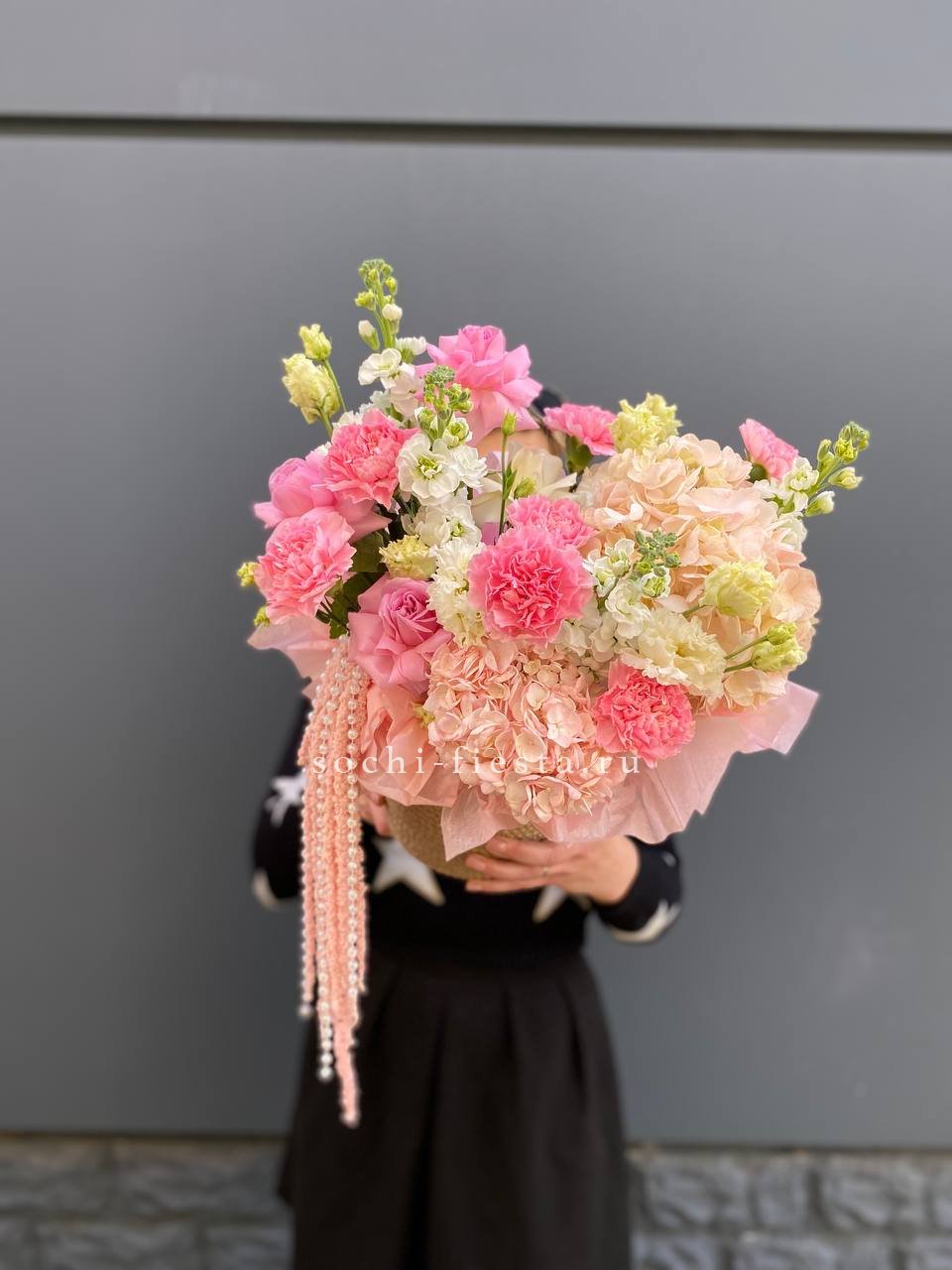 Белоснежные розы и воздушная гортензия создают объёмную композицию с мягкими переходами оттенков. Эустома и диантус добавляют фактурности, а лимониум заполняет пространство между крупными бутонами.