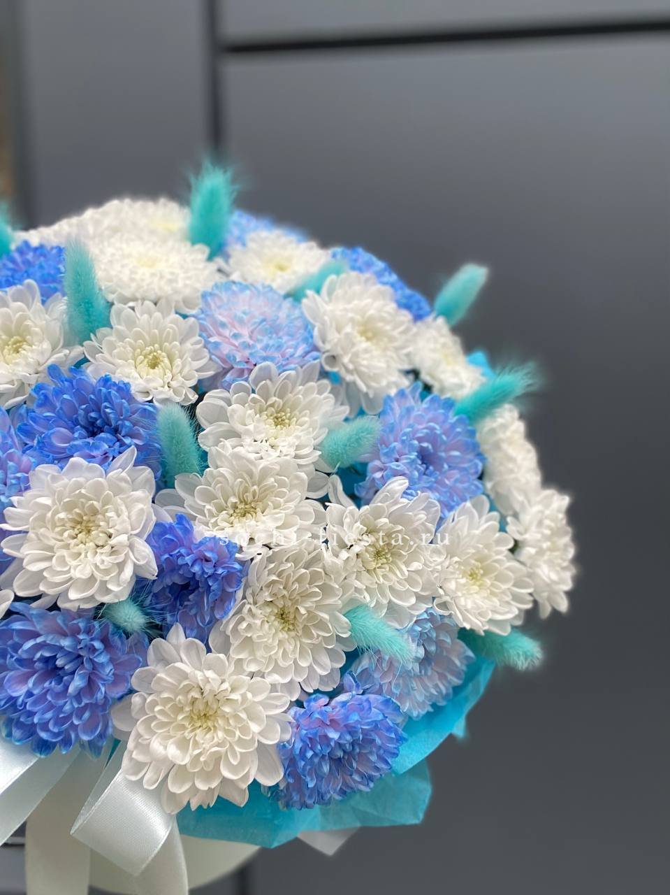 Пушистые соцветия хризантем и воздушный лагурус собраны в компактную коробочку. Голубая гамма напоминает морской бриз и летний день у воды.