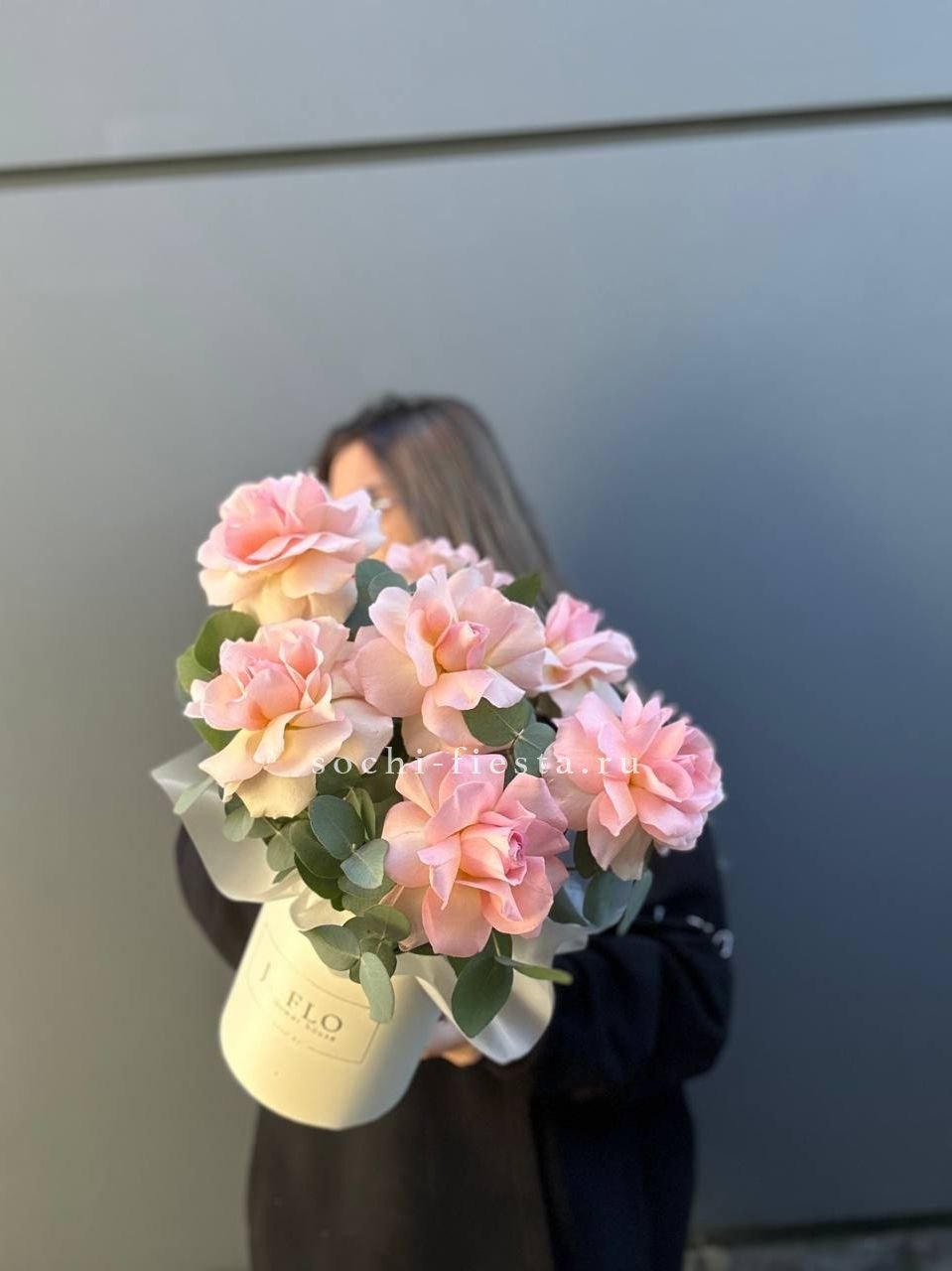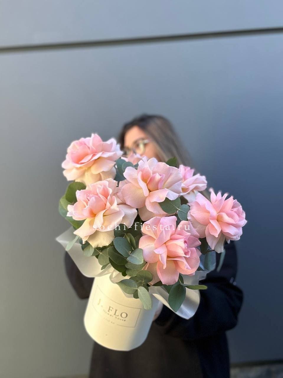 Розовые оттенки переплетаются с пыльной зеленью эвкалипта. Семь бутонов создают мягкое цветовое пятно, которое успокаивает взгляд.