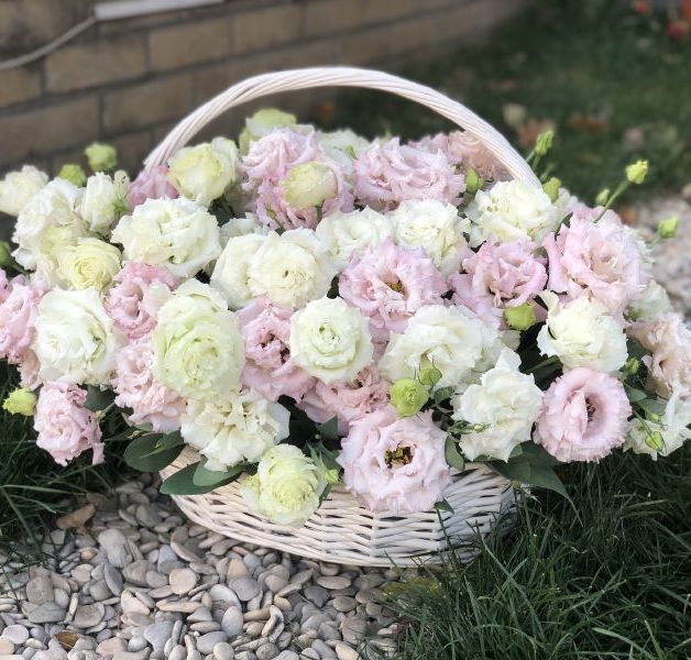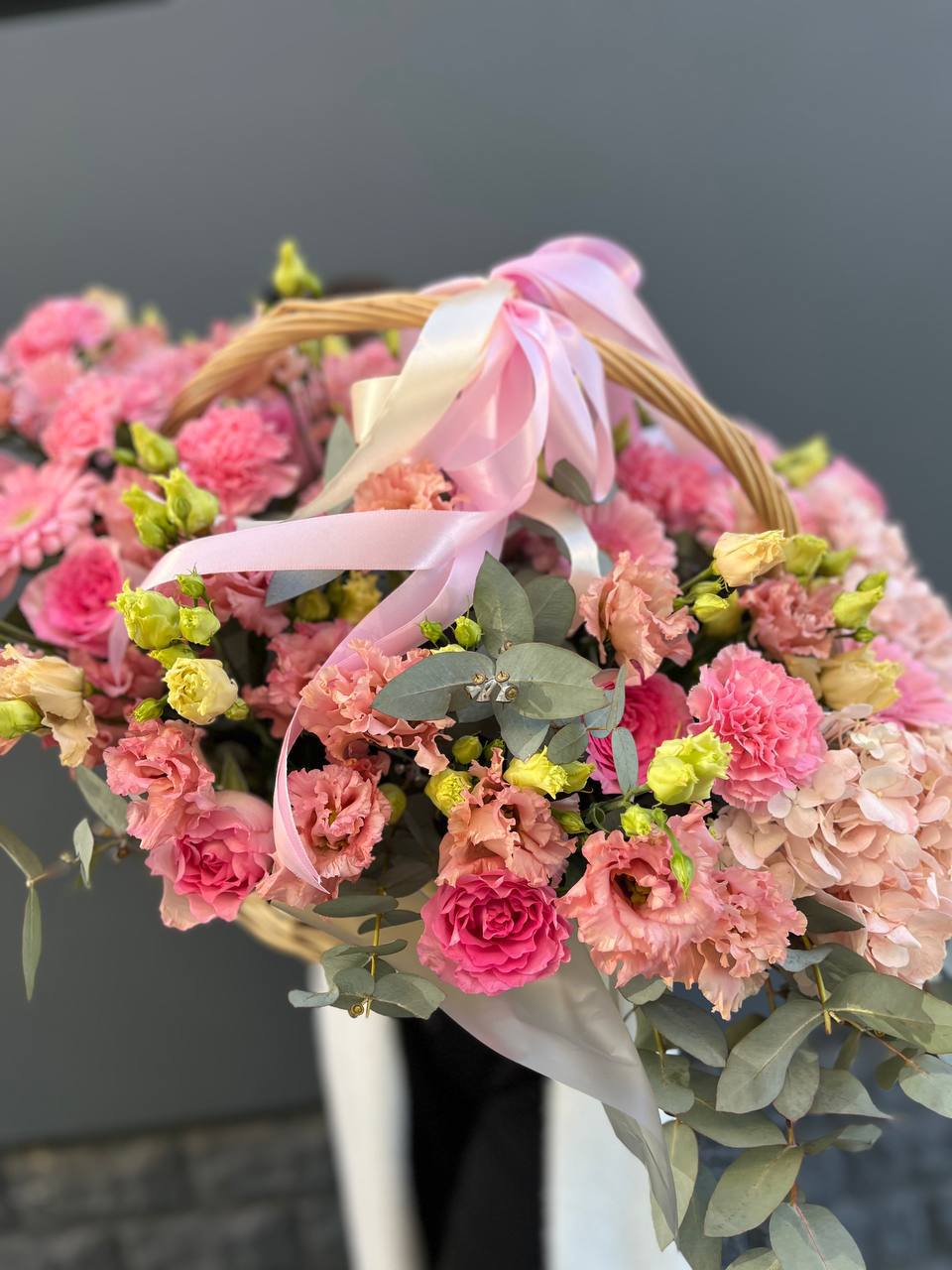 гортензия, диантус, розовая роза, эустома, гербера, корзина средняя, наполнение.